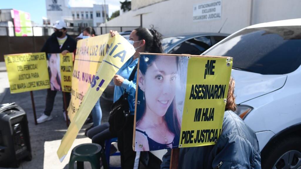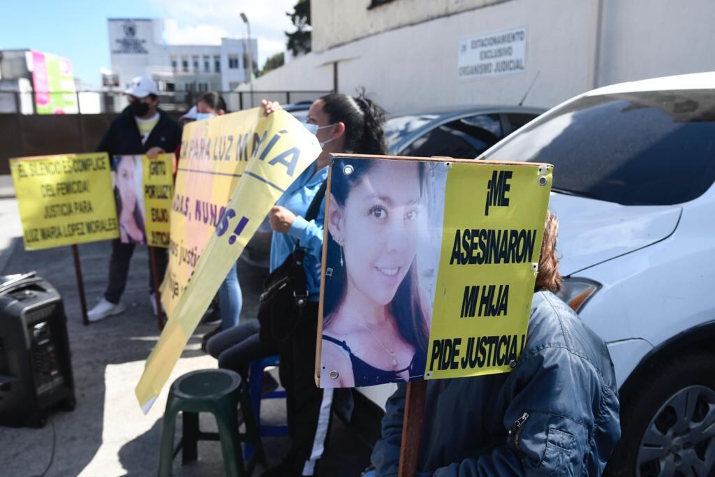 Familiares y amigos de Luz María López protestan frente a las instalaciones del Centro de Justicia de Delitos de Femicidio y Violencia contra la Mujer, ubicado en zona 10.
