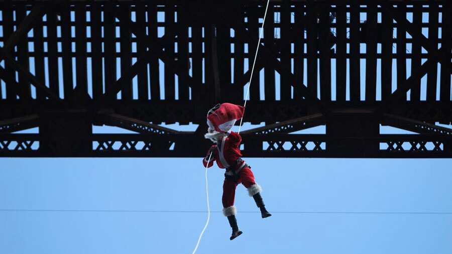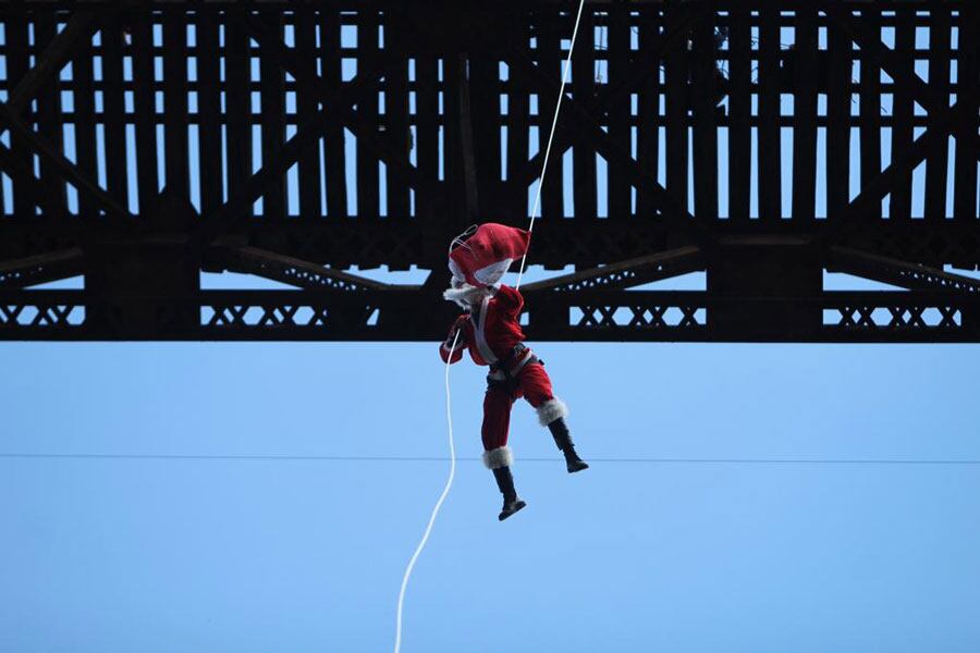 El mayor Chacón nuevamente se vistió como Santa Claus, se puso el arnés y descendió desde lo alto del puente aledaño al Belice y dio alegría.
