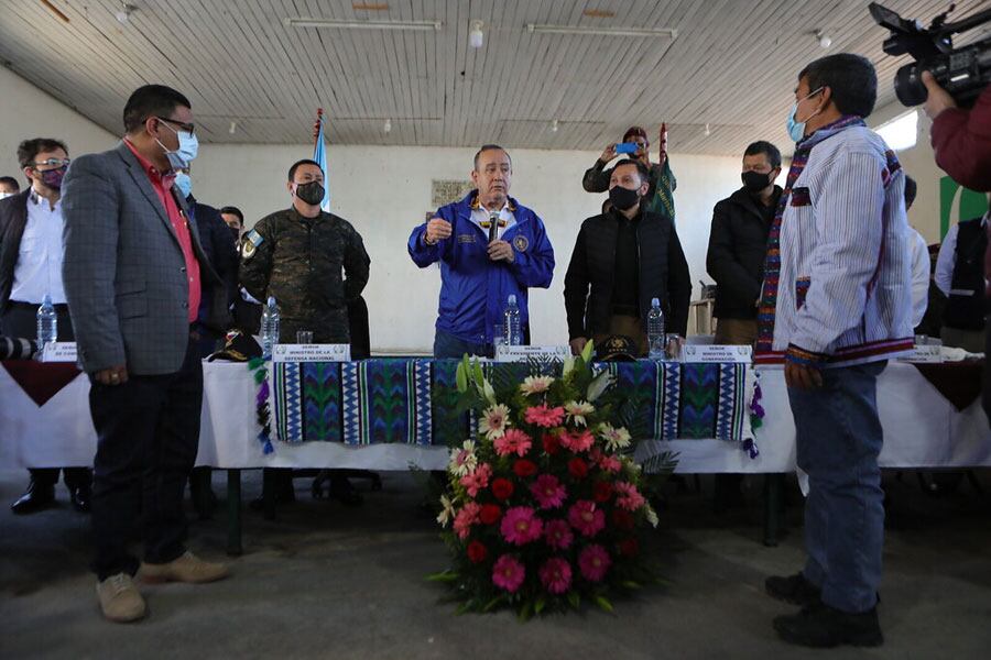 Giammattei se hizo acompañar por los ministros de Gobernación, de la Defensa, de Comunicaciones, el director de Copadeh, el secretario de Comunicación Social de la Presidencia, así como de los alcaldes de ambos municipios: Manuel Guarchaj de Nahualá; y Pascual Tambriz, de Santa Catarina Ixtahuacán.