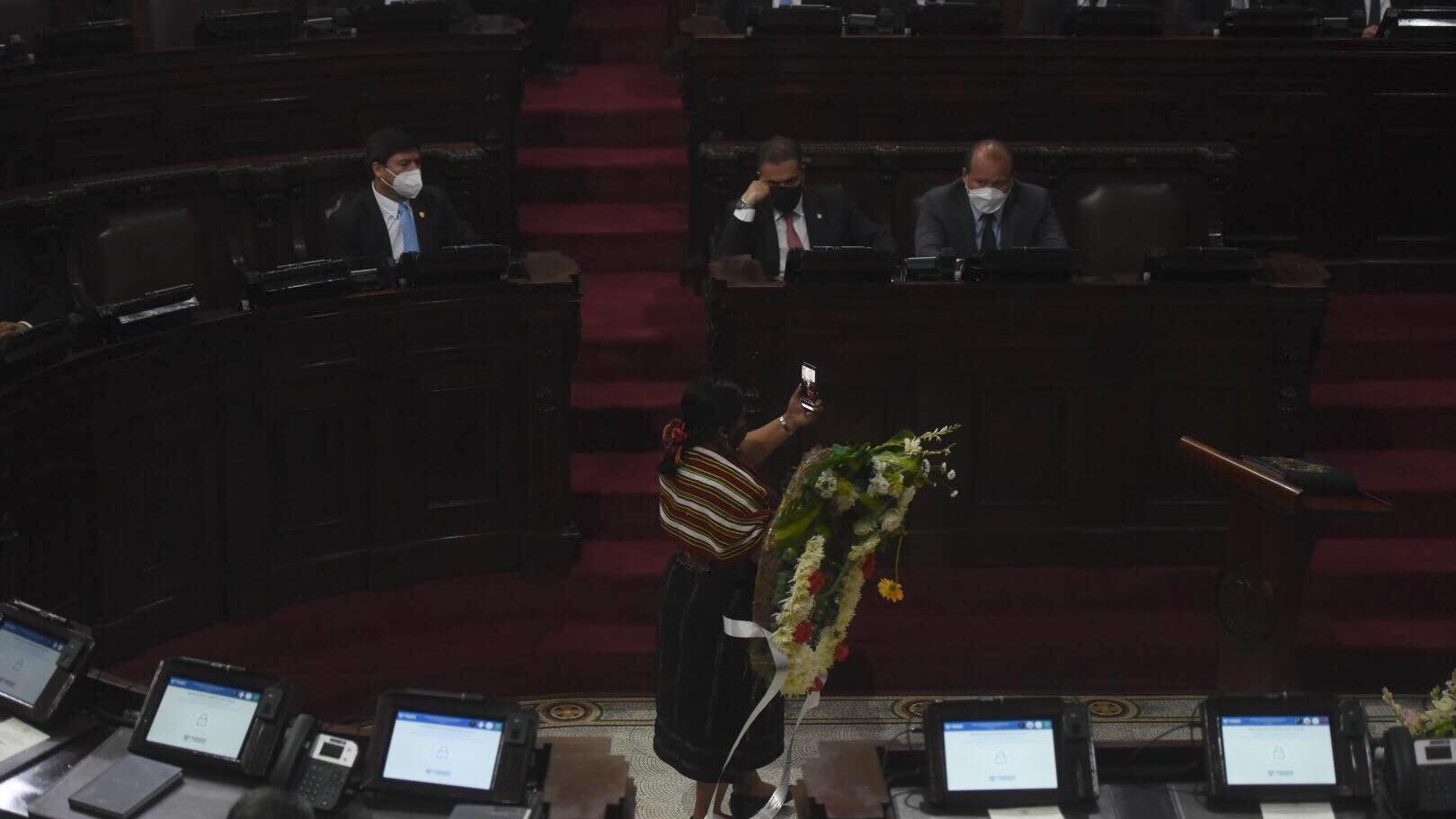 La diputada Vicenta Jerónimo, del Movimiento Para La Liberación De Los Pueblos – MLP, colocó una corona de flores frente al podio en donde el presidente Alejandro Giammattei rendía su informe del segundo año de Gobierno.