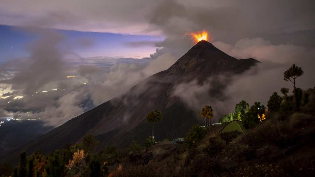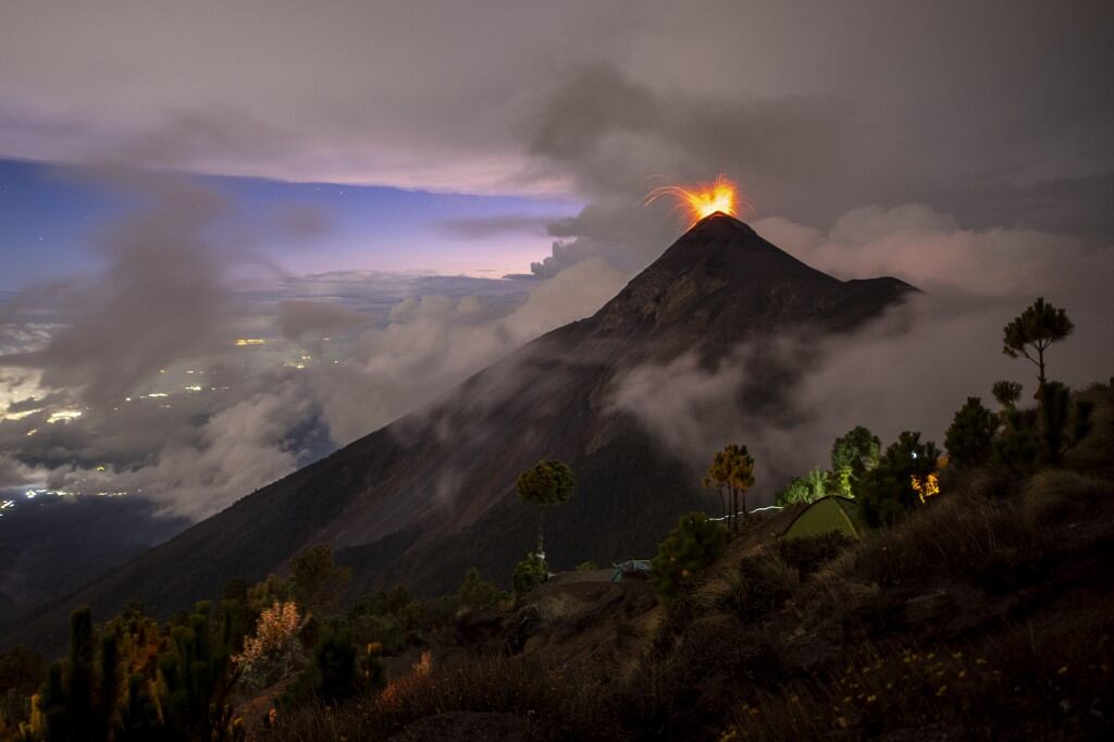 Arropados debido al frío y cerca de una fogata, los turistas escalan y acampan por las noches en laderas del volcán Acatenango, vecino al de El Fuego, desde donde pueden observar la erupción cuando el cielo está despejado.
