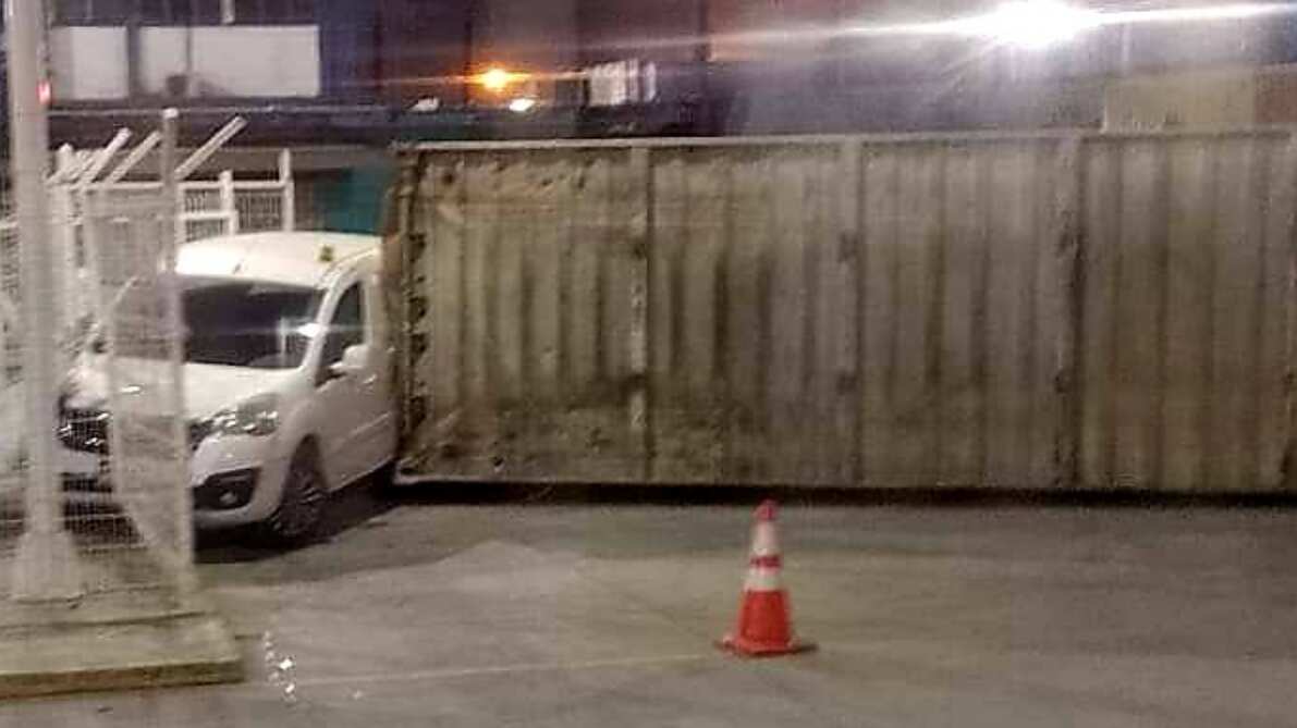 De acuerdo con la información, por causas desconocidas un contenedor se desprendió de la plataforma cuando era movilizado hacia otro sector, ocasionando afortunadamente solo daños materiales.