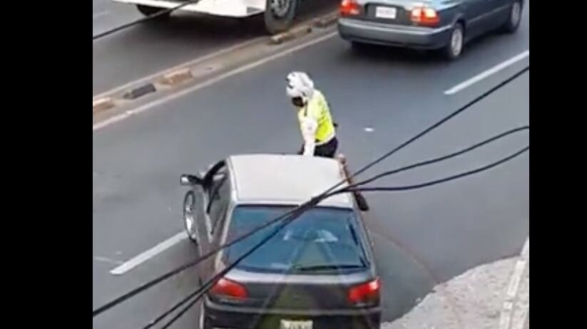 A pesar del peligro que corría el agente, el automovilista no detuvo la marcha y subía la velocidad ante la mirada de otros automovilistas y peatones.
