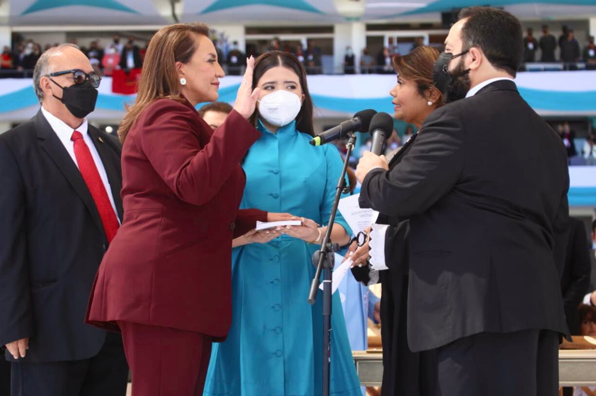 “Prometo ser fiel a la República, cumplir y hacer cumplir la Constitución y sus leyes”, dijo la nueva mandataria hondureña ante la jueza Carla Romero. Redondo le impuso a Castro la banda presidencial frente a unas 29 mil personas reunidas en el Estadio Nacional de Tegucigalpa, a pesar de la pandemia de Covid-19.