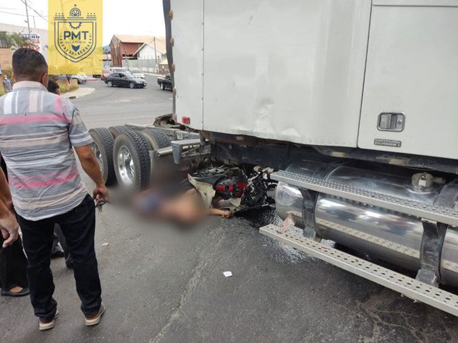 El vehículo de dos ruedas quedó por debajo de las llantas dobles del cabezal, así como el cuerpo de una de las víctimas.