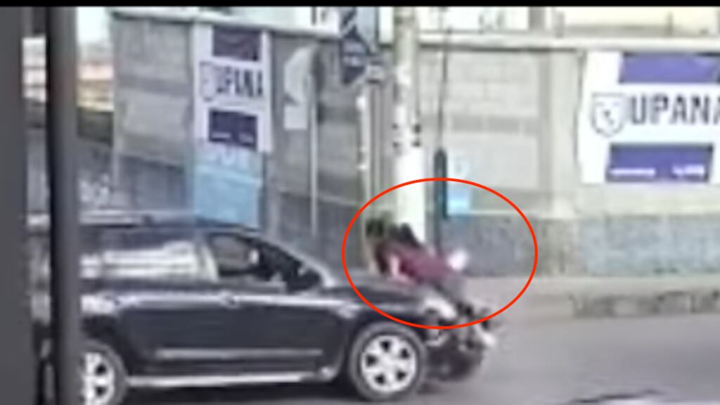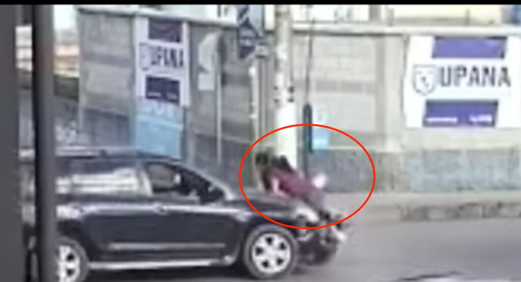 Tras el impacto, una mujer logra ponerse de pie, mientras que el conductor de la motocicleta no reacciona y se queda tendido en el suelo.