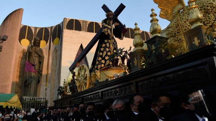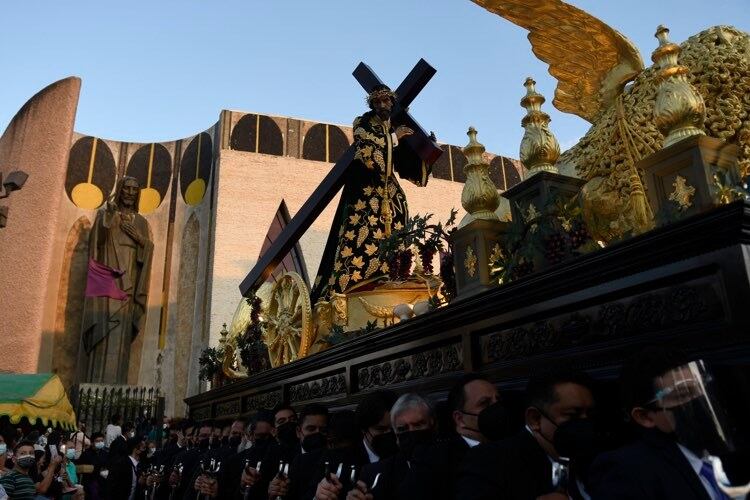La imagen de Jesús Nazareno de la Paz del templo de Don Bosco recorre las calles de la ciudad de Guatemala, en el marco del tercer sábado de Cuaresma. Previo a la salida del cortejo procesional se desarrolló una misa a cargo del padre Oscar Rodriguez Blanco. Luego de la eucaristía hicieron honras a las personas que han muerto de Covid-19.