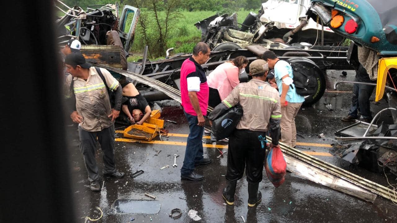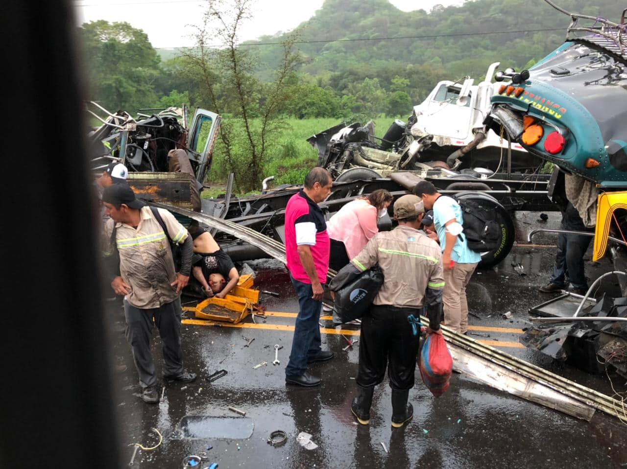 “Hace unos minutos un accidente de tránsito se suscitó en el kilómetro 71 de la ruta al Pacífico Un bus de los transportes Quiroa colisionó contra un tráiler. Piloto del bus fallecido y varios heridos”, detalla el reporte bomberil.