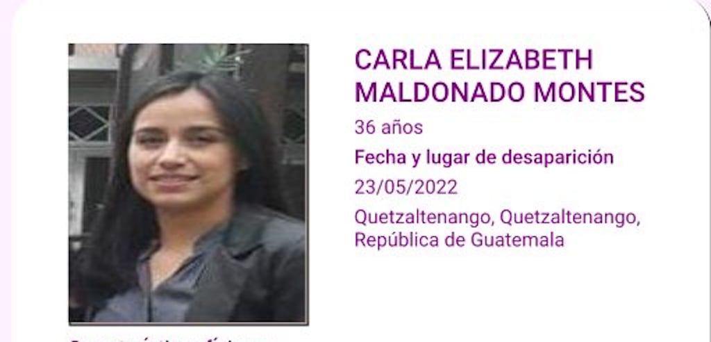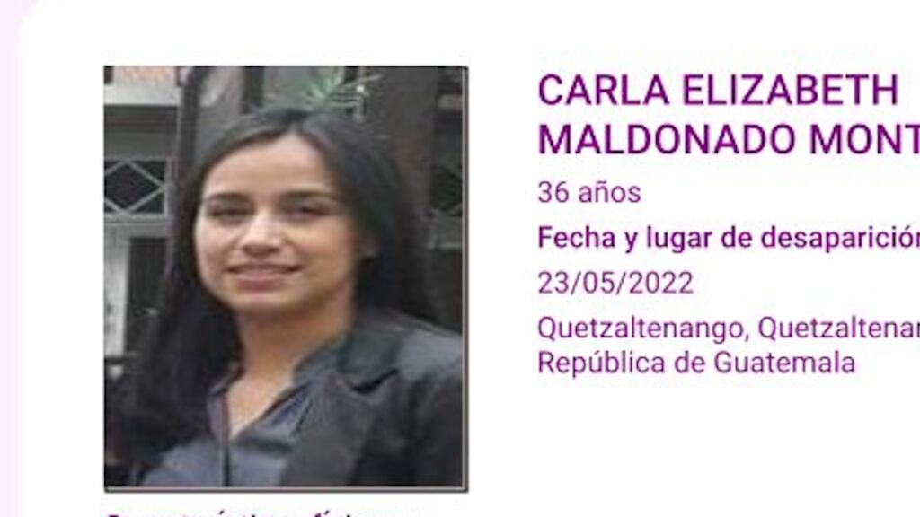 Se activó una Alerta Isabel-Claudina para localizar a Carla Elizabeth Maldonado Montes, de 36 años, quien desapareció el 23 de mayo de 2022, en el municipio de Quetzaltenango.