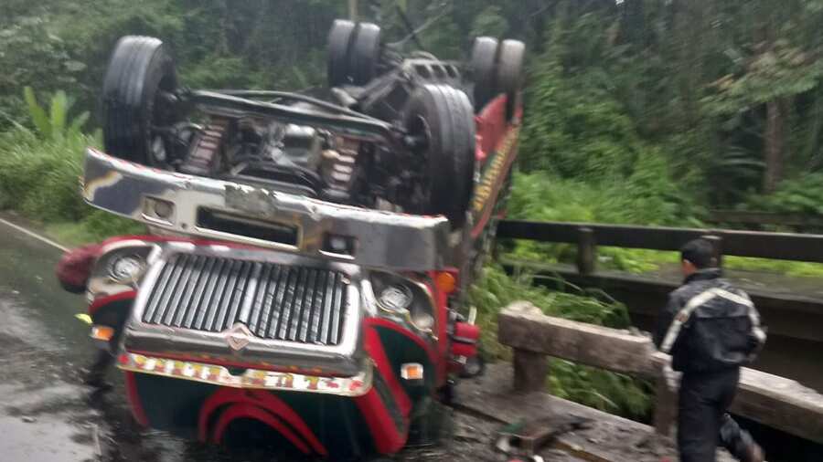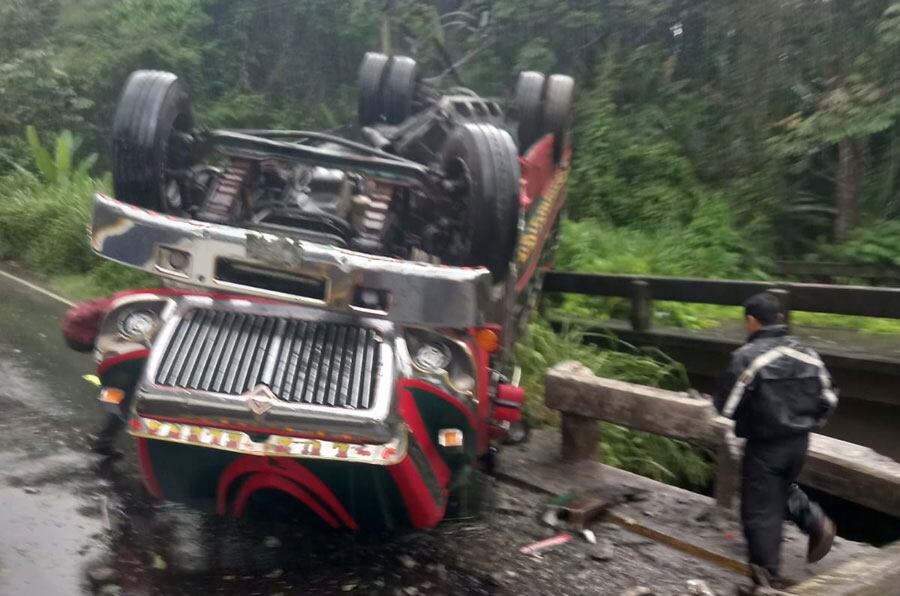 Unidad de Transportes Esmeralda queda volcada a la orilla de la carretera, en el kilómetro 102 de la ruta CA-2 Occidente, en un tramo de la carretera que conduce de Patulul, Suchitepéquez, hacia Santa Lucía Cotzumalguapa.