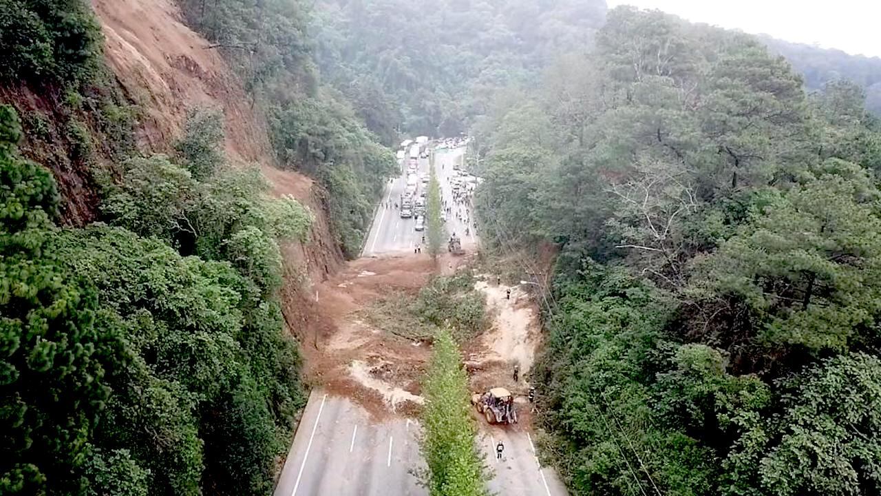 El derrumbe de grandes proporciones ocurrió el pasado domingo. La ladera que se desprendió a un costado de la carretera cubrió los carriles en ambas vías de la carretera. Dos vehículos casi quedaron atrapados.