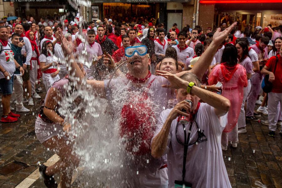 “Da igual la lluvia. Simplemente ver esa plaza llena de nuevo es una pasada”, celebró Saioa Guembe Pena, una funcionaria de 54 años, con su camiseta blanca ya rosada por el vino que caía.