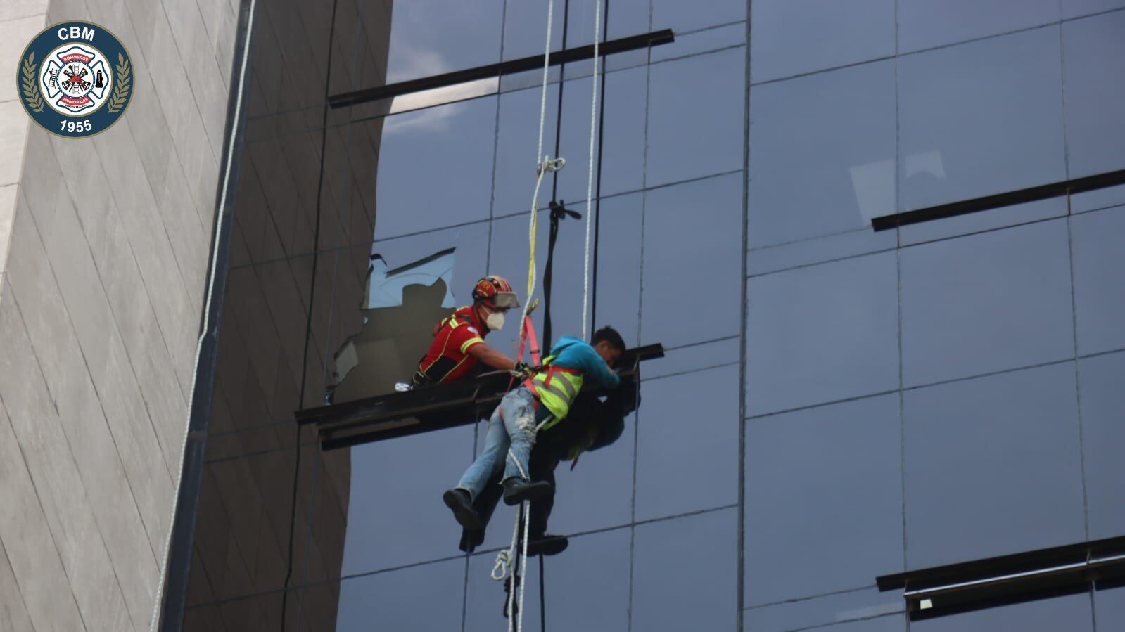 El mediodía de este martes, 12 de julio de 2022, elementos de Cuerpo de Bomberos Municipales rescataron a un hombre que quedó suspendido en las alturas mientras realizaba un trabajo de limpieza en las ventanas de un edificio, ubicado en la zona 10 capitalina.