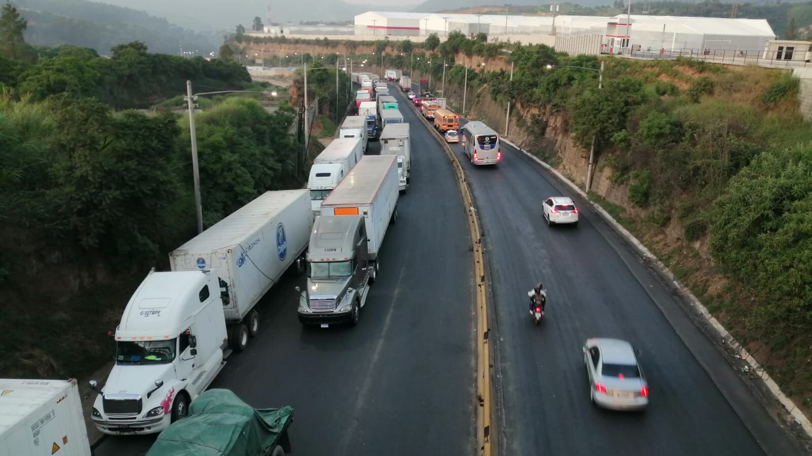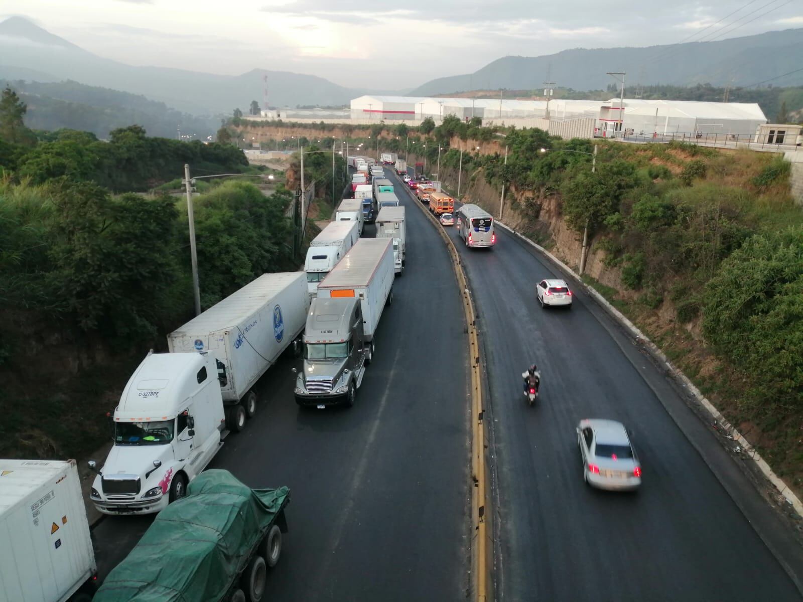 Los traileros se formaron en dos filas y esperan sobre la carretera desde el kilómetro 22 al 24. La extensión de vehículos pesados en ese sector afecta la movilidad de vecinos que se dirigen desde Amatitlán y la Costa Sur, indicó Quevedo.