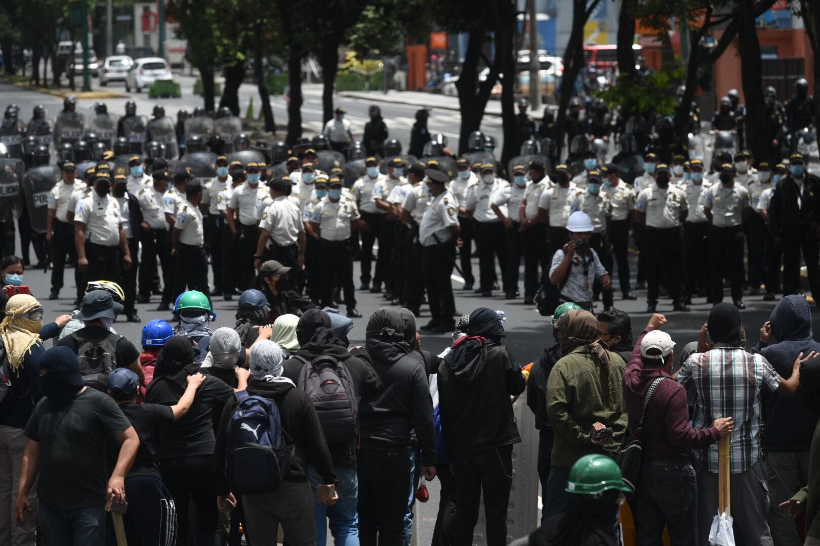 Un grupo de antimotines de la Policía Nacional Civil dio un ultimátum a un grupo de manifestantes ubicado frente a la Universidad de San Carlos de Guatemala (Usac), que bloquea la avenida Petapa. Aunque de momento no se registran enfrentamientos, el ambiente es de tensión.
