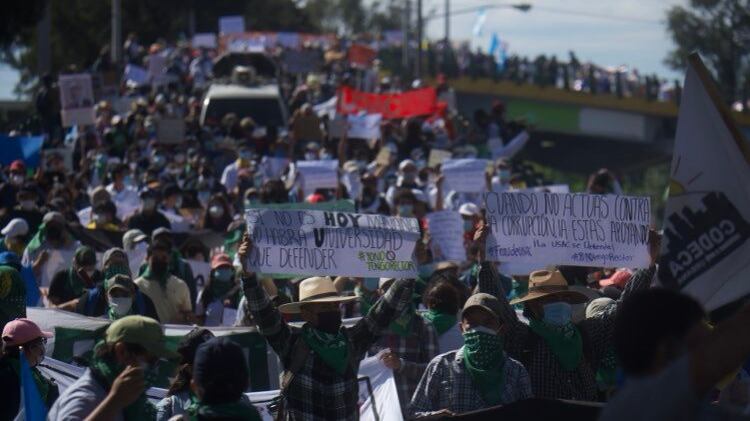Miles de estudiantes, indígenas y miembros de grupos sociales marcharon este jueves en la capital para denunciar corrupción en el gobierno del presidente Alejandro Giammattei y un fraude para elegir al rector de la Universidad de San Carlos de Guatemala (USAC).
