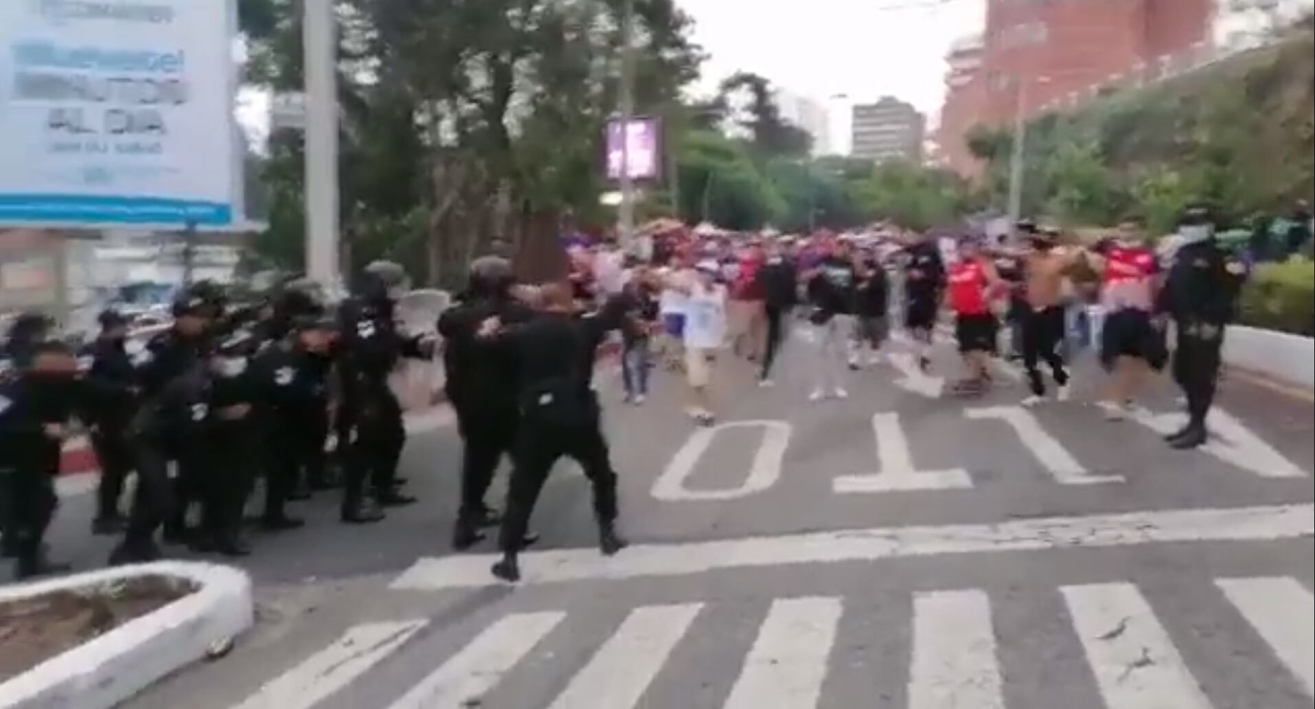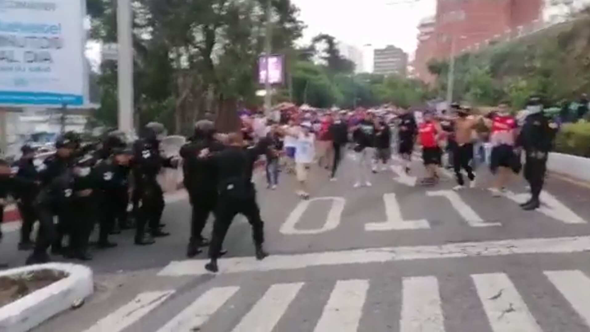 Los antimotines de la Policía Nacional Civil intervinieron de forma inmediata ante la violencia que se generó afuera del estadio. Los aficionados logrona ser dispersos al lanzar gases lacrimógenos.