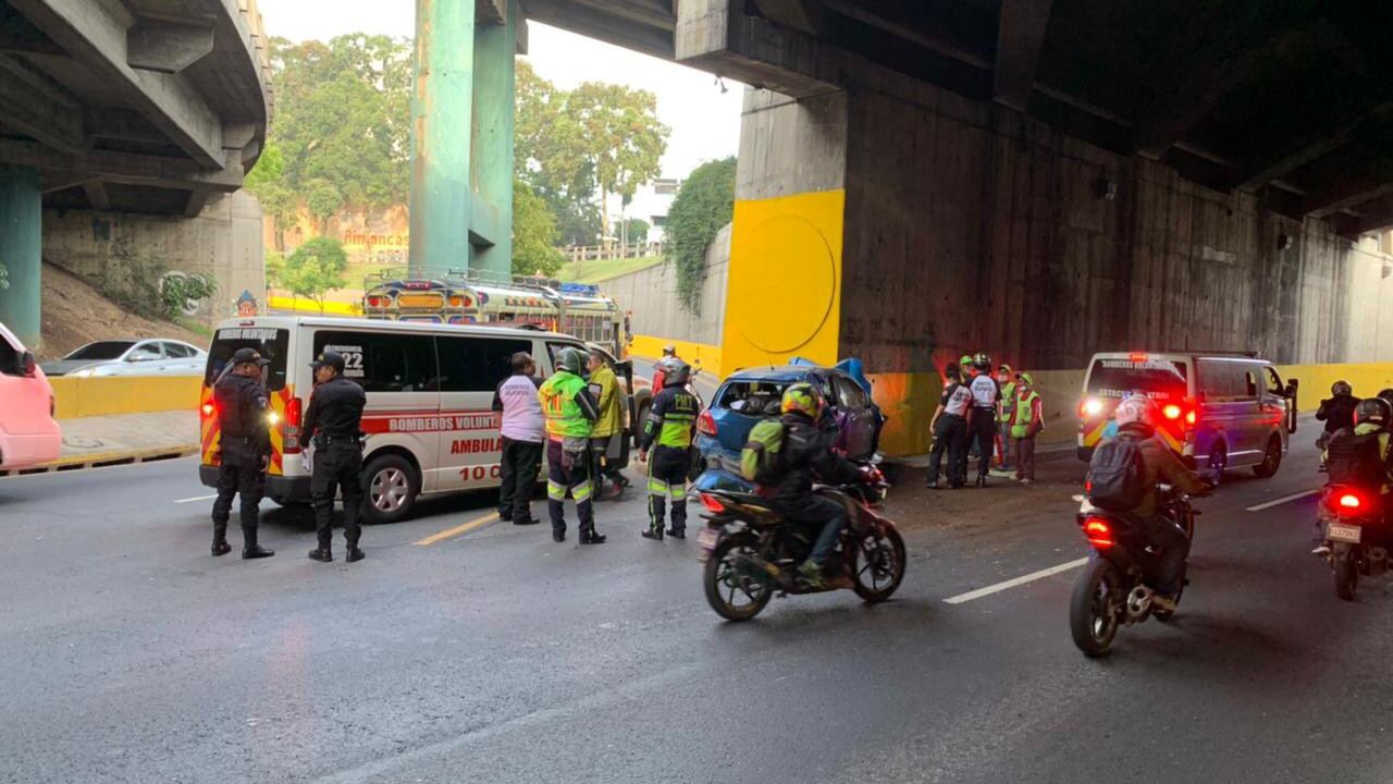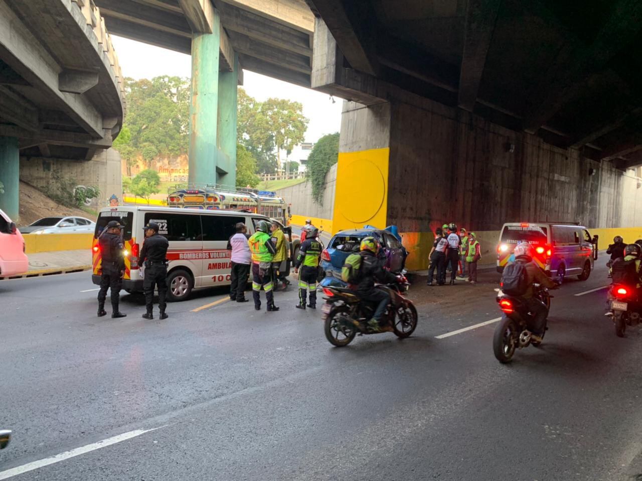 Los Bomberos Voluntarios auxiliaron a una conductora herida luego de un accidente de tránsito en el paso a desnivel del bulevar Liberación, en la zona 13.