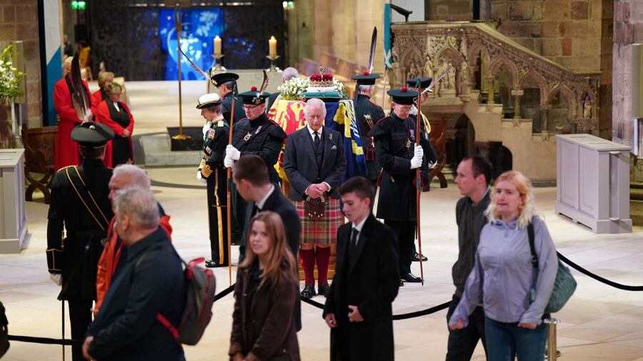 Los restos mortales de Isabel II, cubiertos por el estandarte real escocés, flores blancas y la corona de Escocia, permanecerán en la catedral de Edimburgo hasta la tarde del martes, cuando un avión los traslade a Londres.