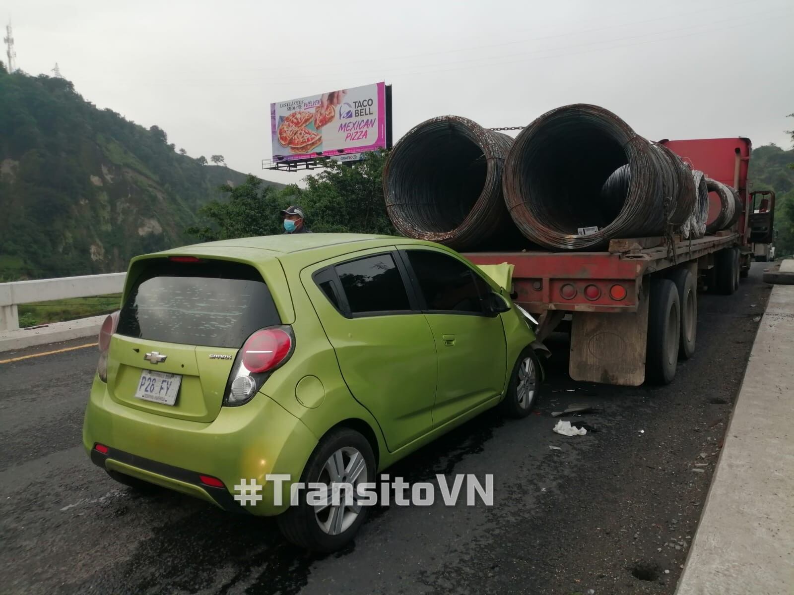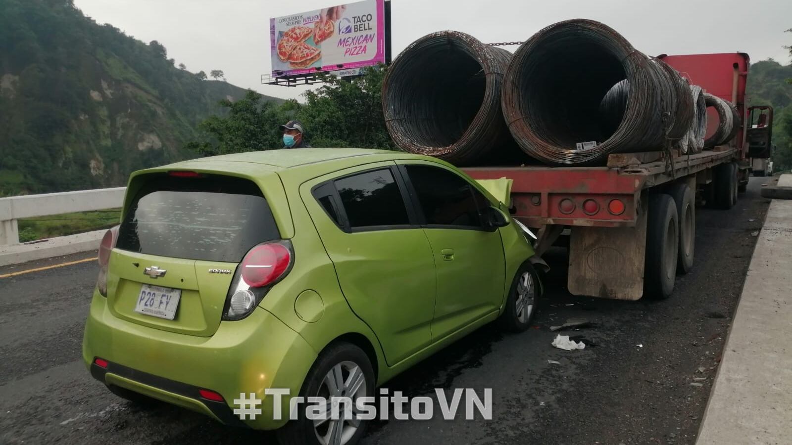 El primer accidente vial sucedió en el kilómetro 13.5 de ruta al Pacífico esta mañana. En esa vía, un automóvil verde chocó la parte trasera de una plataforma de un tráiler que transportaba hierro.