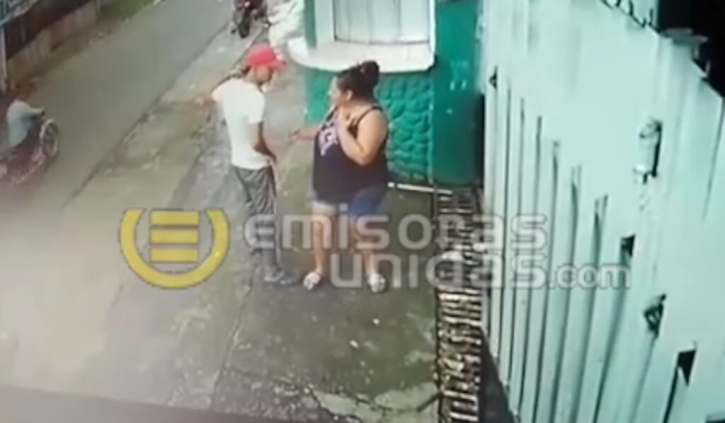 Dos individuos que se conducían en una motocicleta asaltaron a una mujer que se encontraba afuera de su vivienda junto a dos menores de edad, según las imágenes captadas por una cámara de seguridad. Uno de los delincuentes desciende de la moto y saca un arma de fuego con la que amenaza a su víctima, a quien despojó de sus pertenencias.