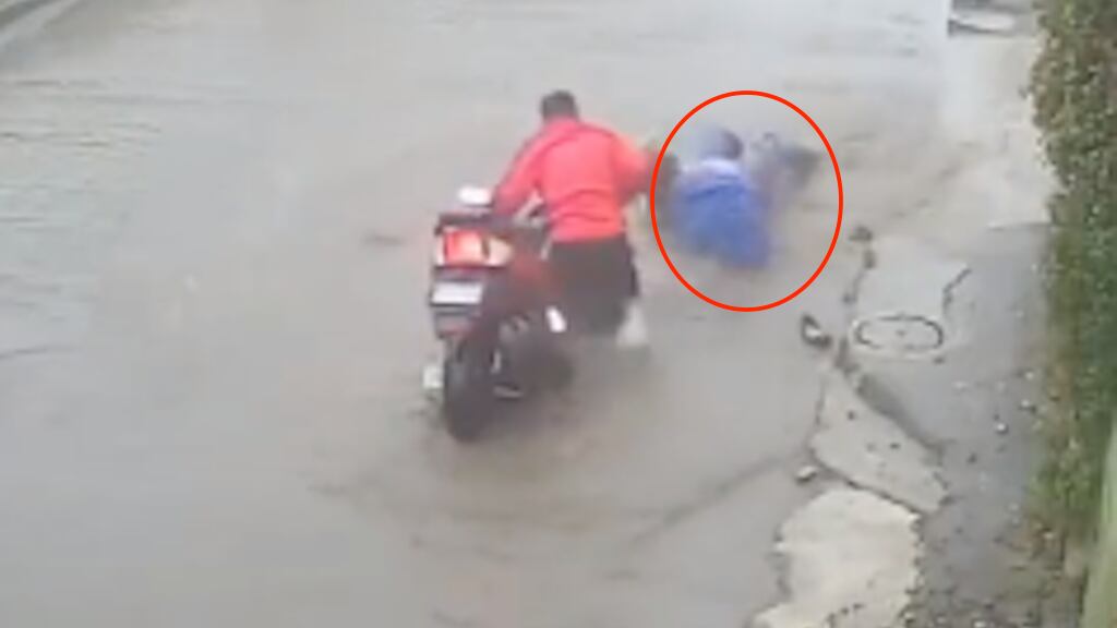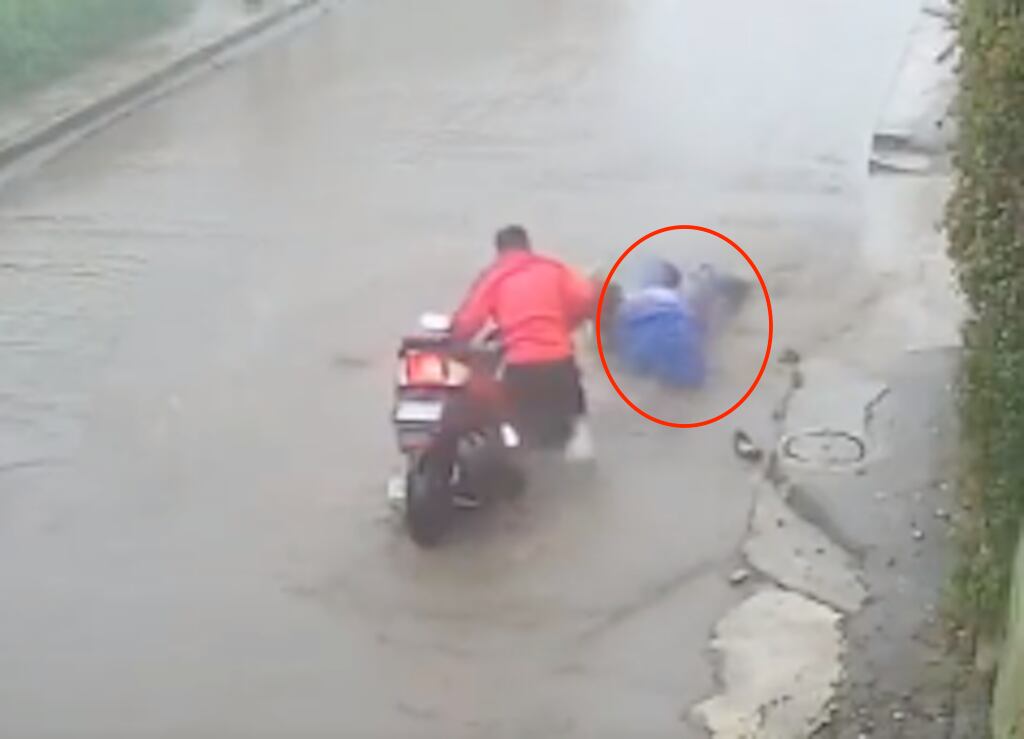 En redes sociales fue difundido el video en el que se observa el momento exacto en el que el motociclista y su acompañante se conducen sobre una calle inundada a causa de las intensas lluvias que afectan el territorio nacional. Sin embargo, en el momento menos esperado caen sobre un enorme agujero a la mitad del camino.