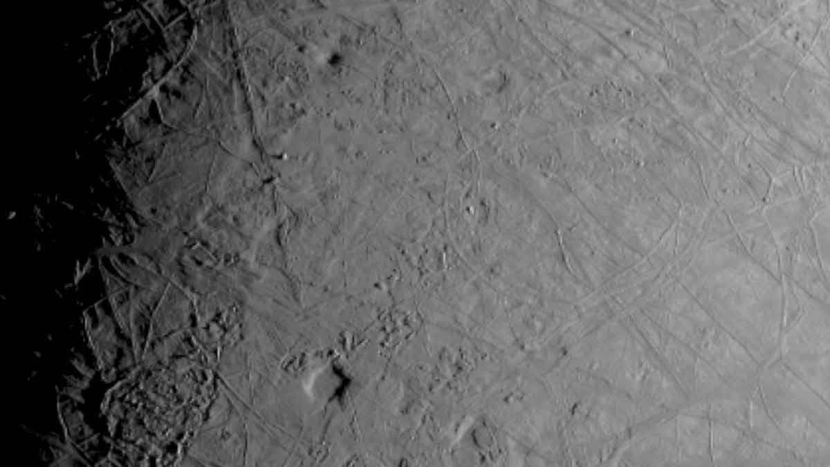 De acuerdo con la Administración Nacional de Aeronáutica y del Espacio (NASA), este segmento de la primera imagen de Europa tomada durante este sobrevuelo por la JunoCam se acerca a una franja de la superficie de “Europa” al norte del ecuador. Debido al contraste mejorado entre la luz y la sombra que se ve a lo largo del límite del lado nocturno las características del terreno accidentado se ven fácilmente, incluidos los bloques altos que proyectan sombras, mientras que las crestas y valles brillantes y oscuros se curvan a lo largo de la superficie.