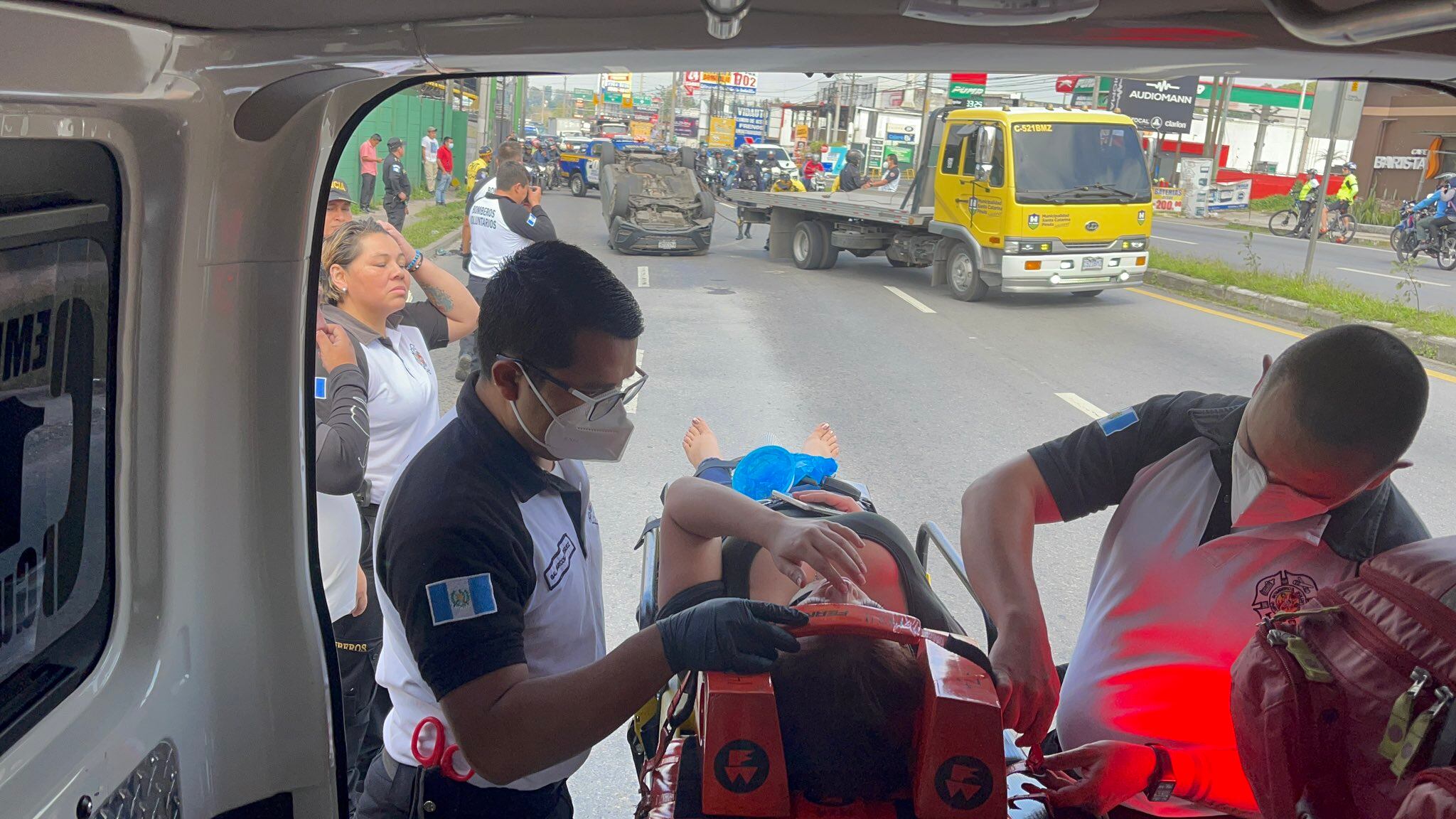 “Por causas no establecidas un automóvil vuelca en el kilómetro 13 de la ruta a El Salvador, la conductora resultó con golpes en diferentes regiones del cuerpo, por lo que fue trasladada hacia la emergencia del Hospital Roosevelt”, informaron los socorristas.