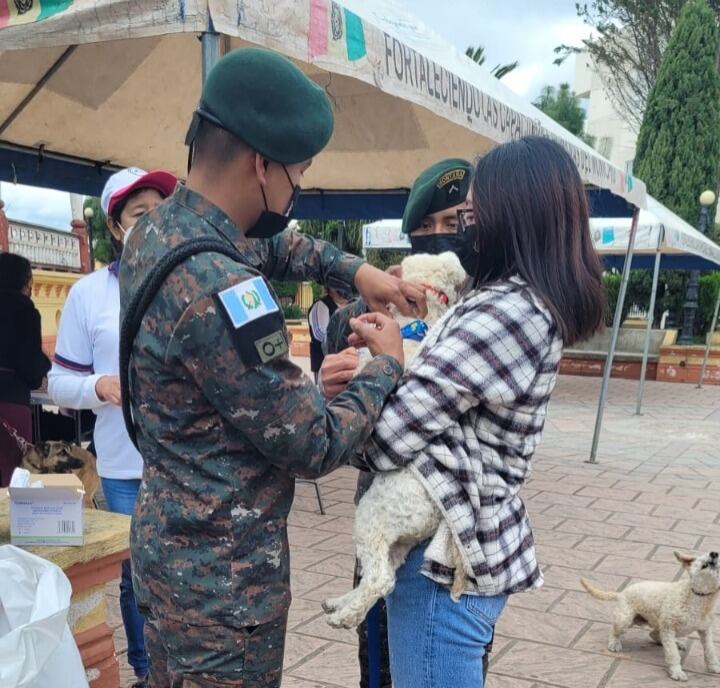 En San Marcos hay apoyo para la administración de la dosis en los perros y gatos por soldados de la Brigada de Operaciones para Montaña.