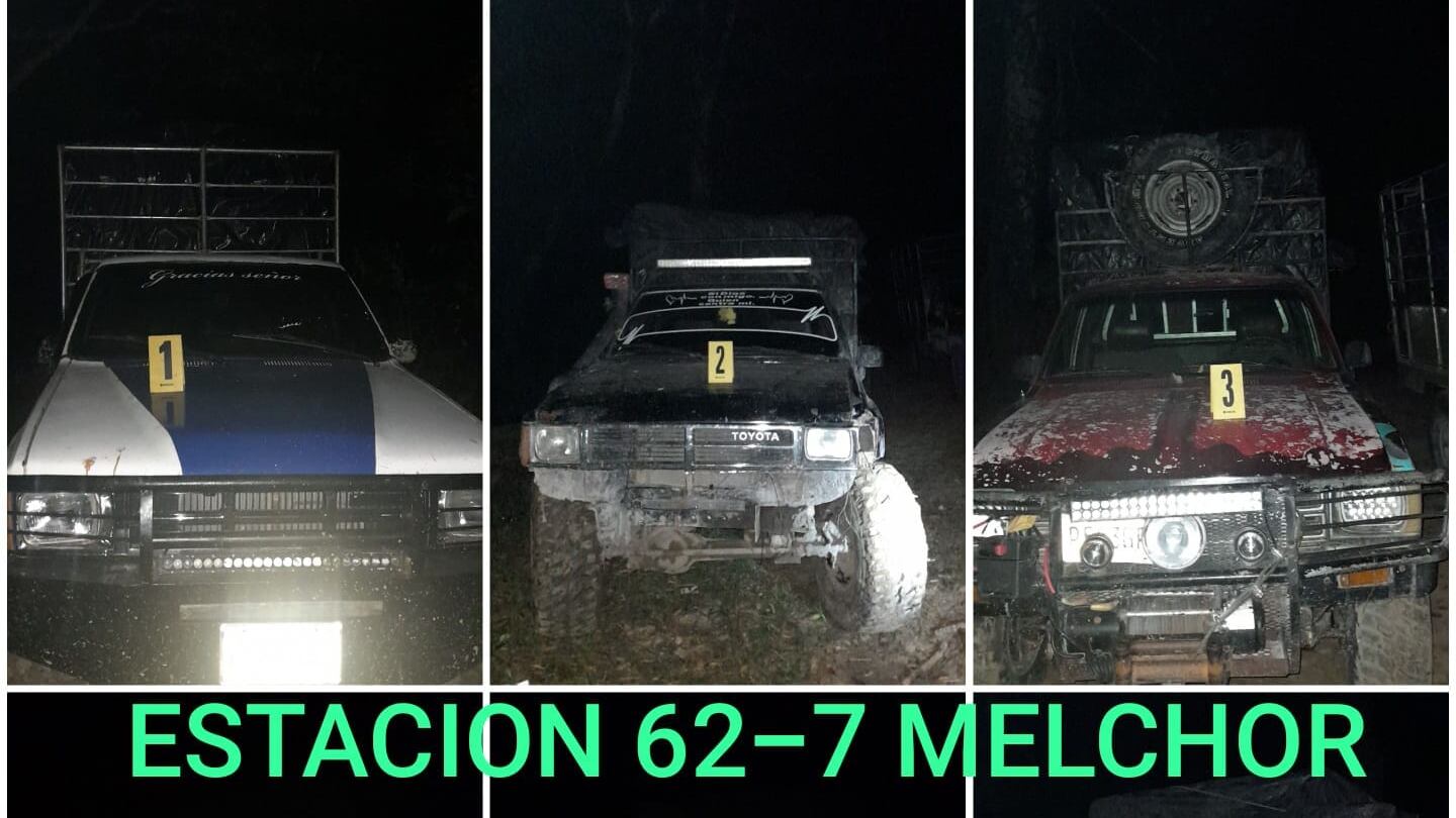 “A orillas del río Mopán, Melchor de Mencos, Petén, agentes de la Policía Nacional Civil con el apoyo del Ejército de Guatemala, han localizado 5 vehículos abandonados cargados con cigarrillos de contrabando”, informó la PNC.