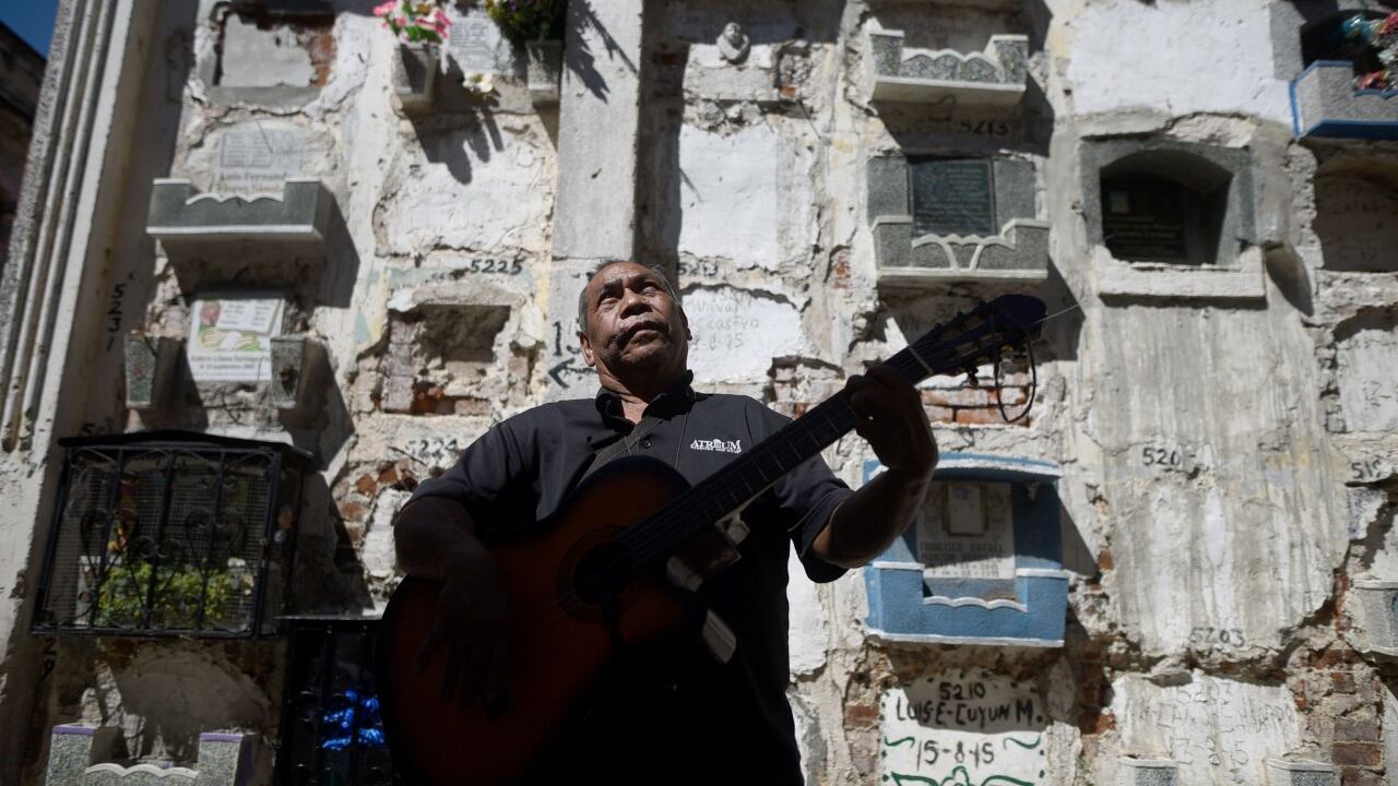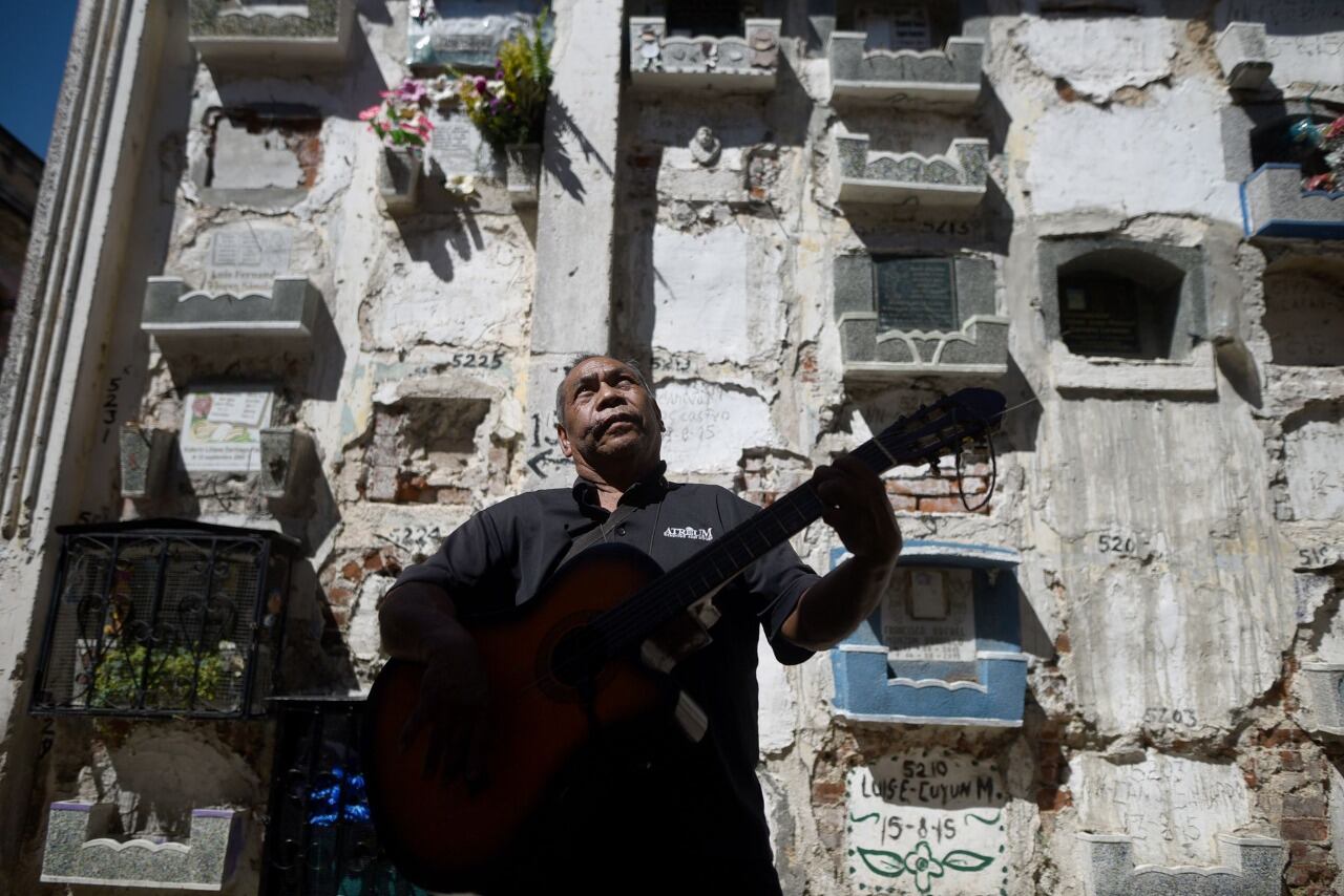 Con guitarra en mano, Vidal camina por los callejones del cementerio donde también aprovecha a visitar las tumbas de sus hermanos, de siete que crecieron juntos han fallecido tres. “Hoy por hoy nosotros los recordamos a ellos porque nos enseñaron buenos valores y buenos principios.