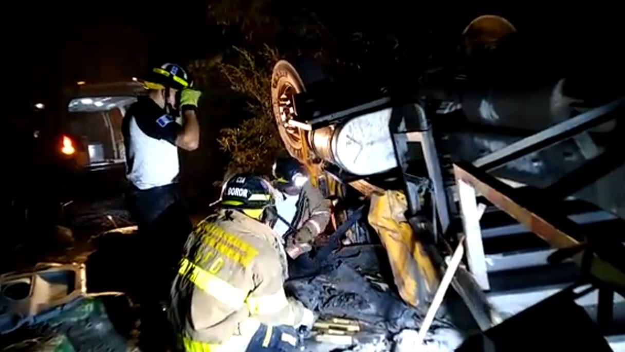 El camión volcó en el kilómetro 59 de la ruta a la aldea Granados y el chofer quedó atrapado. Este accidente fue reportado por automovilistas y motoristas que circulaban por la aldea La Estancia Grande.