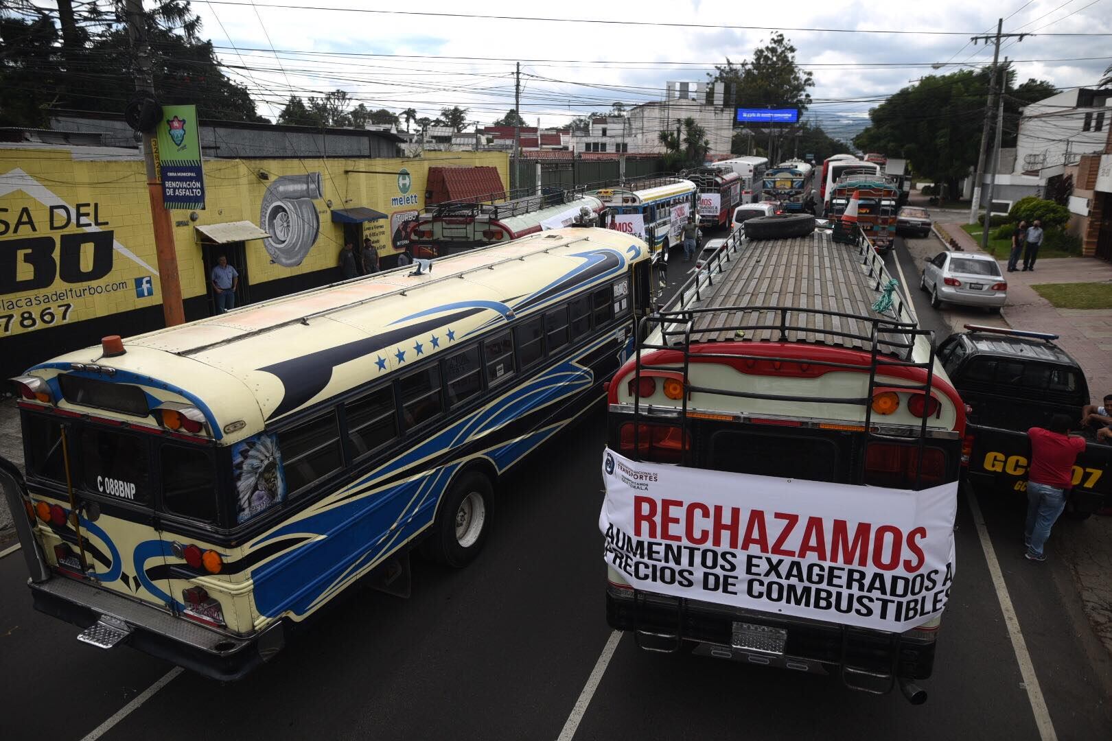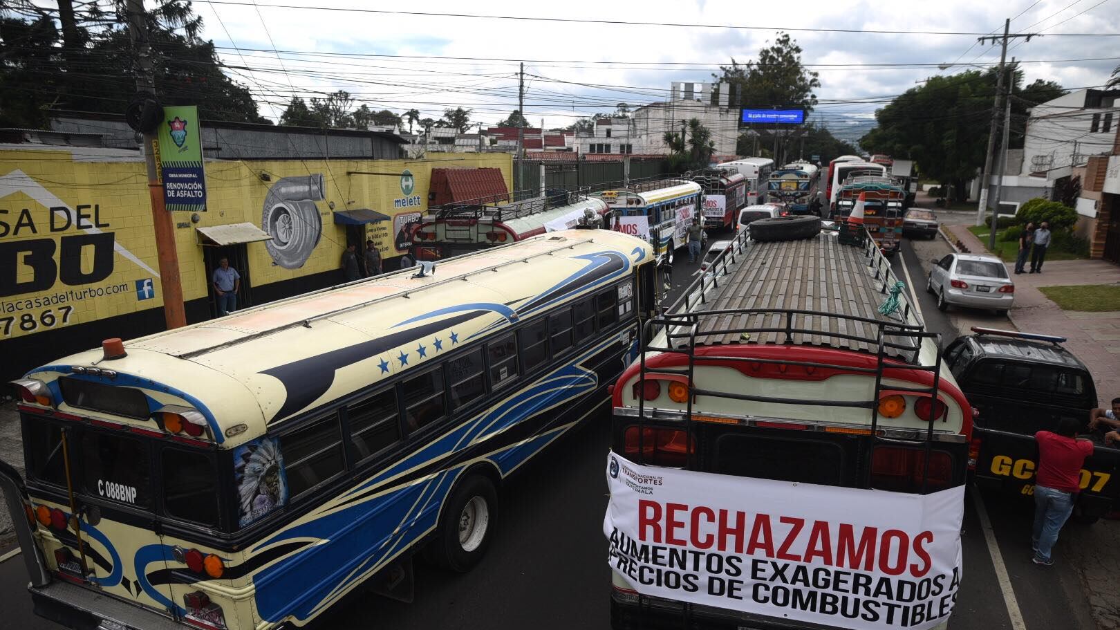 Miembros de la Coordinadora Nacional de Transportes (CNT) se concentran en los ingresos a la Ciudad de Guatemala para protestar contra el alza de los precios del combustible y de la canasta básica.