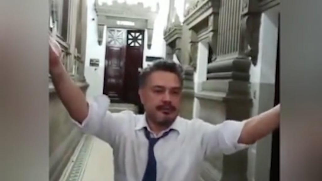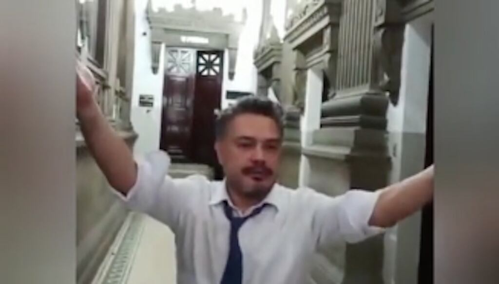 En la grabación se ve cuando el legislador fue auxiliado por uno de los parlamentarios presentes para llegar a su curul, previo a concluir la sesión. Luego recorrió los pasillos mientras le gritaron que se encontraba en estado de ebriedad.