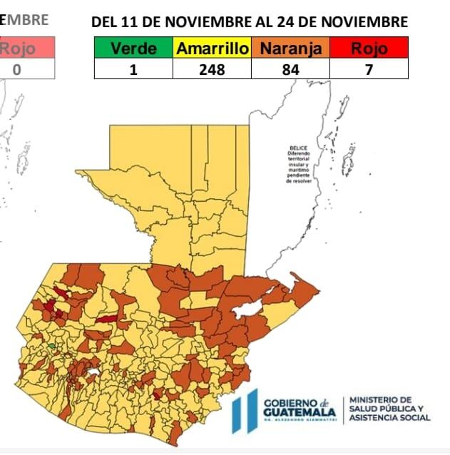 Guatemala vuelve a tener municipios en alerta roja, según la actualización que compartió el Ministerio de Salud Pública y Asistencia Social (MSPAS) relacionado con el Tablero de Alertas Sanitarias COVID-19.