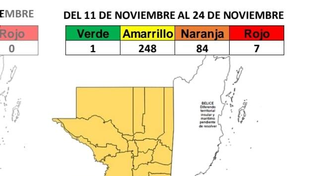 La actualización anterior, que se hizo el 12 de noviembre, marcó por primera vez que el país careció de un solo municipio en rojo. Fueron 65 en naranja; 275 en amarillo y cero en verde.