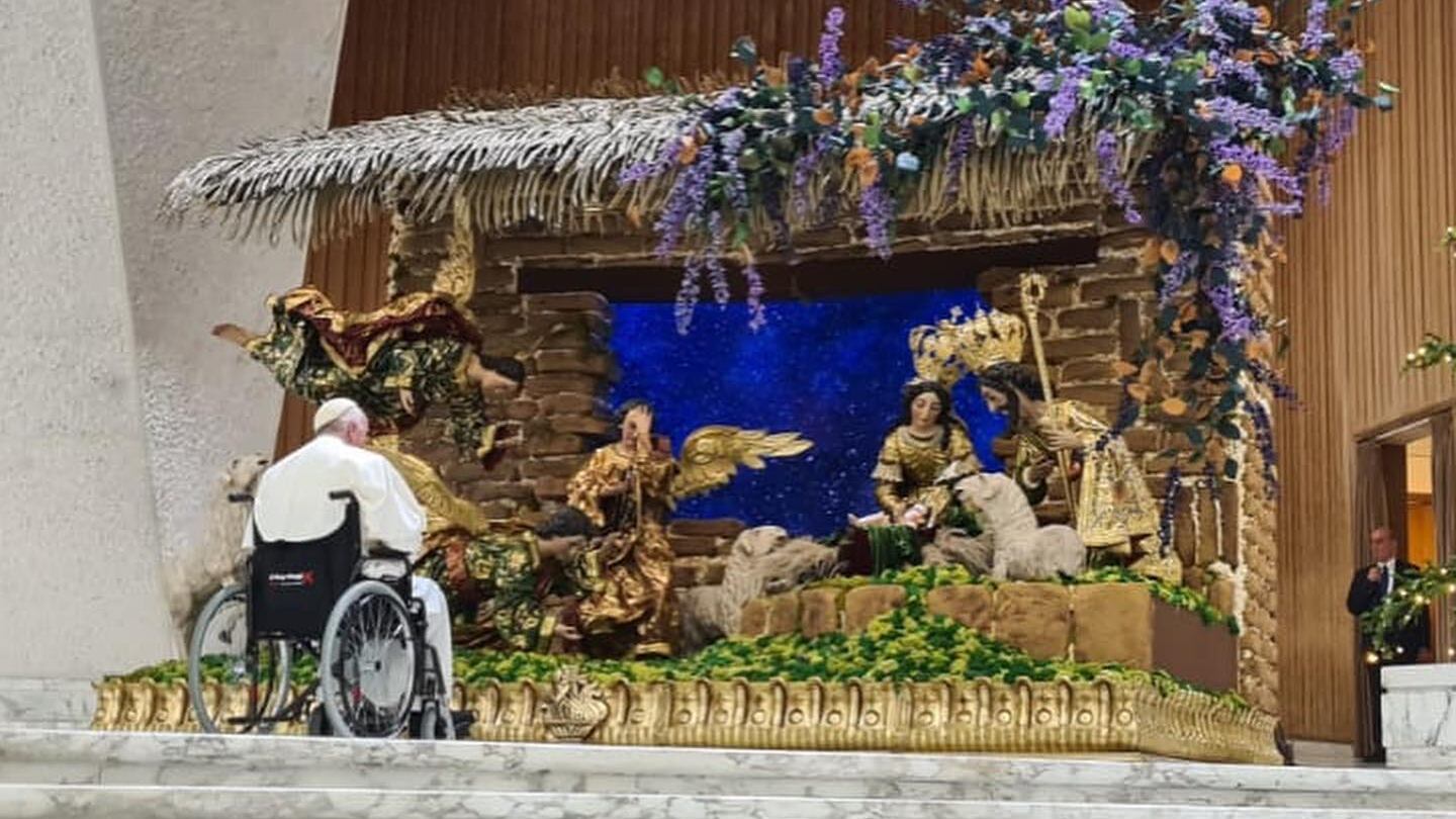El Sumo Pontífice se le aprecia en una silla de ruedas cuando reza frente al pesebre.