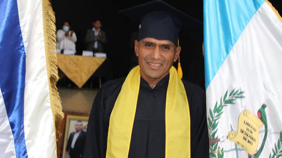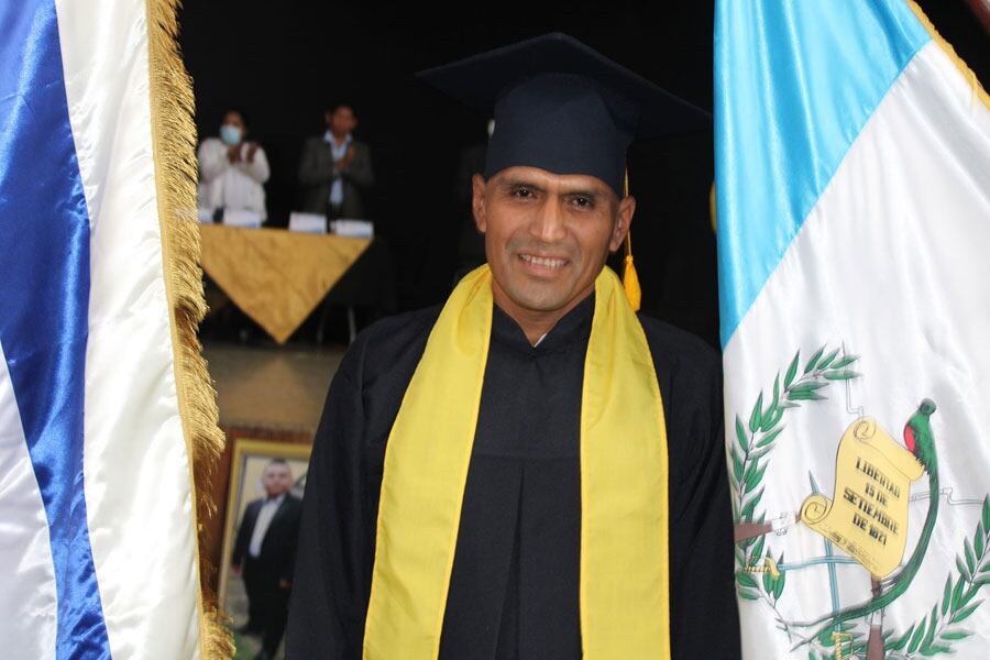 Con toga y junto a los pabellones de Guatemala y de la institución educativa de donde egresa, el alcalde Coc Ba agradeció a Dios por el triunfo académico.