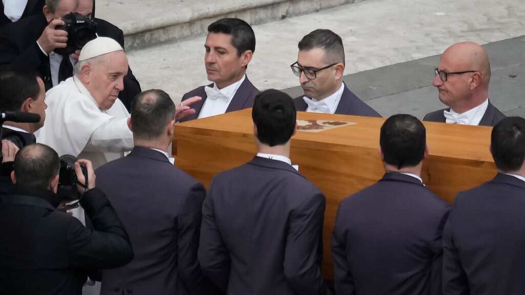 El pedido del Papa argentino fue lanzado ante el sencillo ataúd de madera donde yacía el cuerpo de Joseph Ratzinger, con encima una copia de los Evangelios y colocado en el atrio de la basílica. Al término de la sepultura, de pie, ayudado por su bastón y sin paramentos, Francisco bendijo el ataúd y lo tocó con su mano para despedirlo.