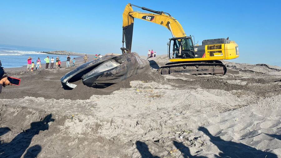 Fotografías del Conap mostraron el momento en el que la ballena fue enterrada en la arena con una máquina excavadora.