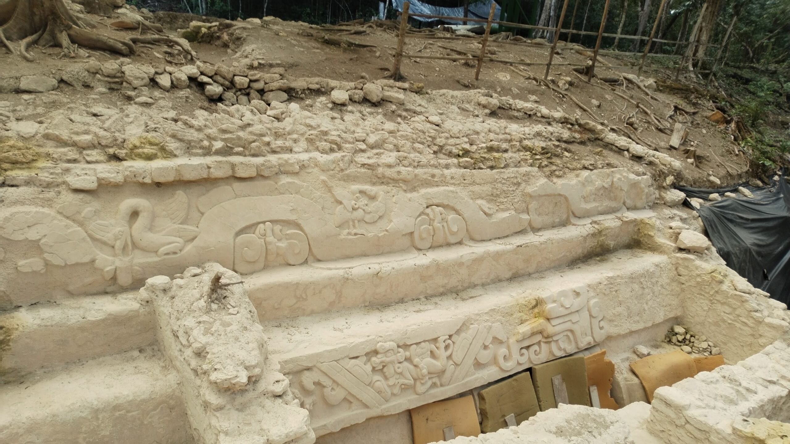 Un friso blanco de los héroes gemelos Hunahpú e Ixbalanqué, personajes del Popol Vuh, el libro sagrado de los mayas, también adorna una calzada de El Mirador.