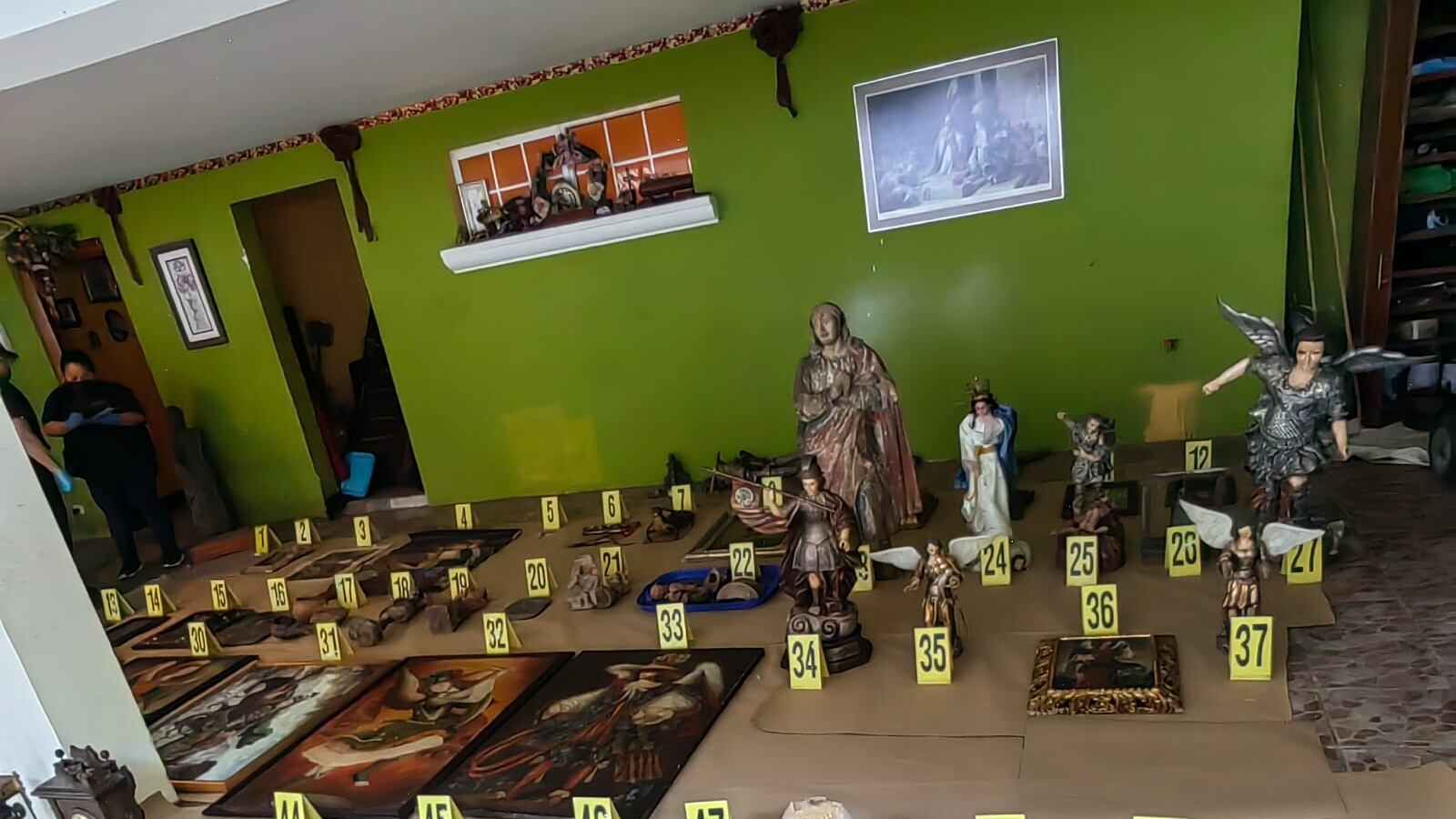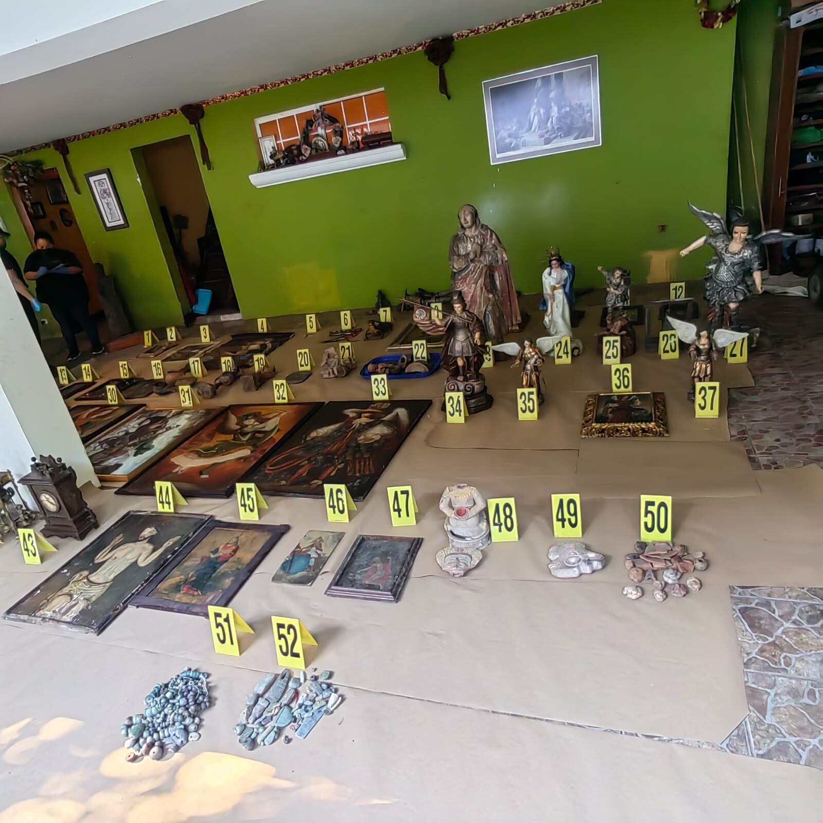 Luego de concluidas las diligencias de allanamiento en seguimiento a una estructura criminal que se dedica al robo y hurto en residencias, el Ministerio Público (MP) reportaron la captura de dos personas y más de 18 obras de arte que se presume son patrimonio de la nación.