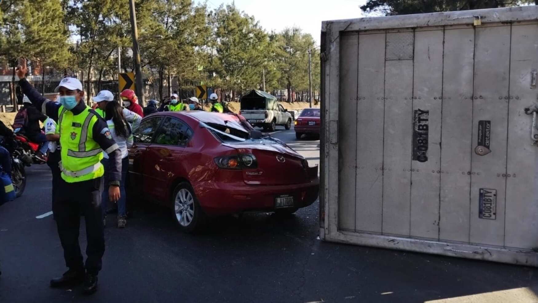 En este accidente se encuentran involucrados tres vehículos, entre estos un camión que quedó volcado en la cinta asfáltica. Al lugar acudieron paramédicos de Bomberos Municipales quienes brindan asistencia a varias personas que sufrieron crisis nerviosa; únicamente reportan daños materiales.