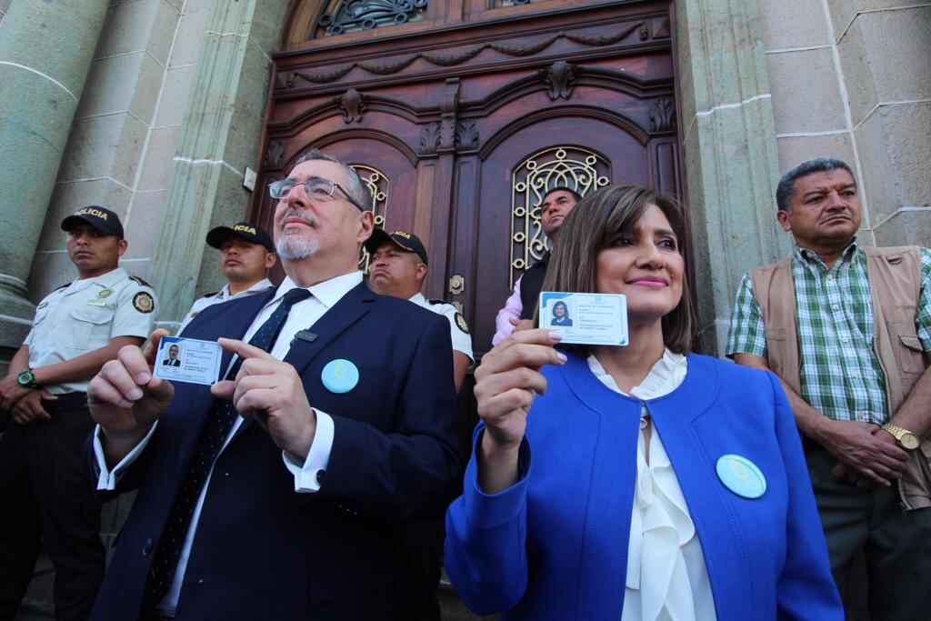 Bernardo Arévalo y Karin Herrera, el binomio presidencial del Movimiento Semilla, se reunieron con sus allegados y juntos caminaron por la sexta avenida de la zona 1. Su destino era el Registro de Ciudadanos del Tribunal Supremo Electoral, donde recibieron sus documentos.