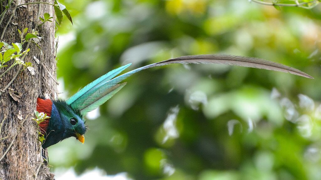 - El quetzal (Pharomachrus mocinno mocinno) pertenece a la familia Trogonidae, que incluye aves de hermosos plumajes verdes, rojos, azulados y amarillos