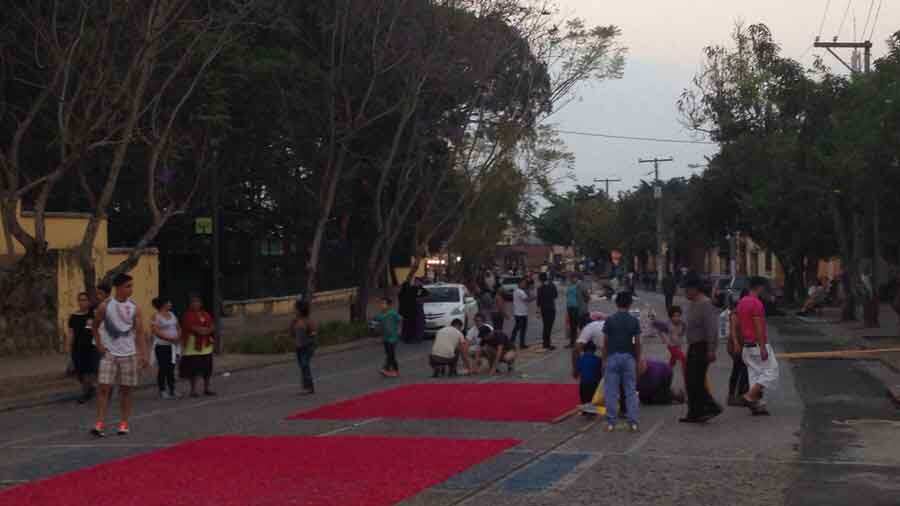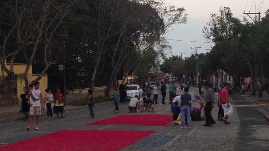 La tradicional avenida Juan Chapín se convierte en un paso colorido y ameno el también llamado “Jueves Blanco” debido a que vecinos llenan dicha calzada con artesanales alfombras de serrín y flores.
