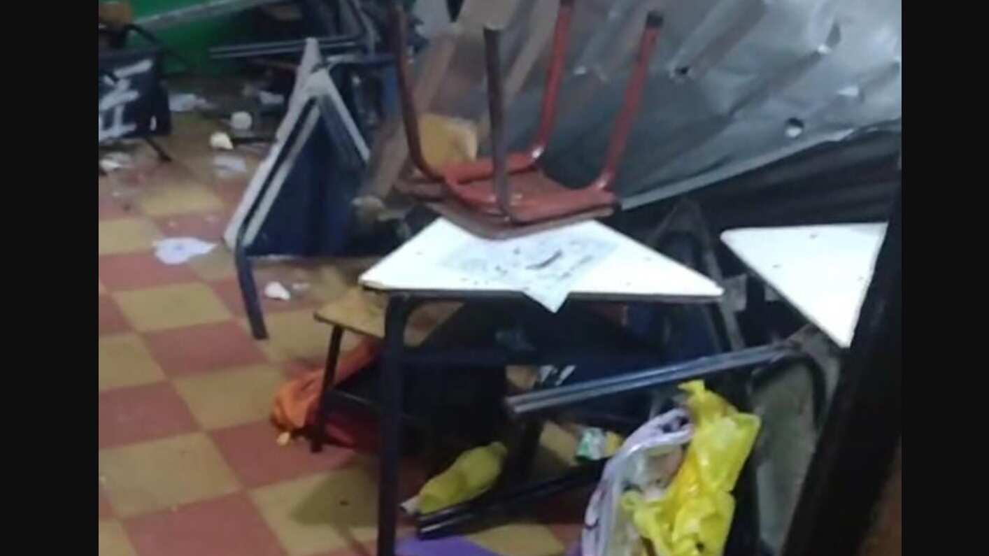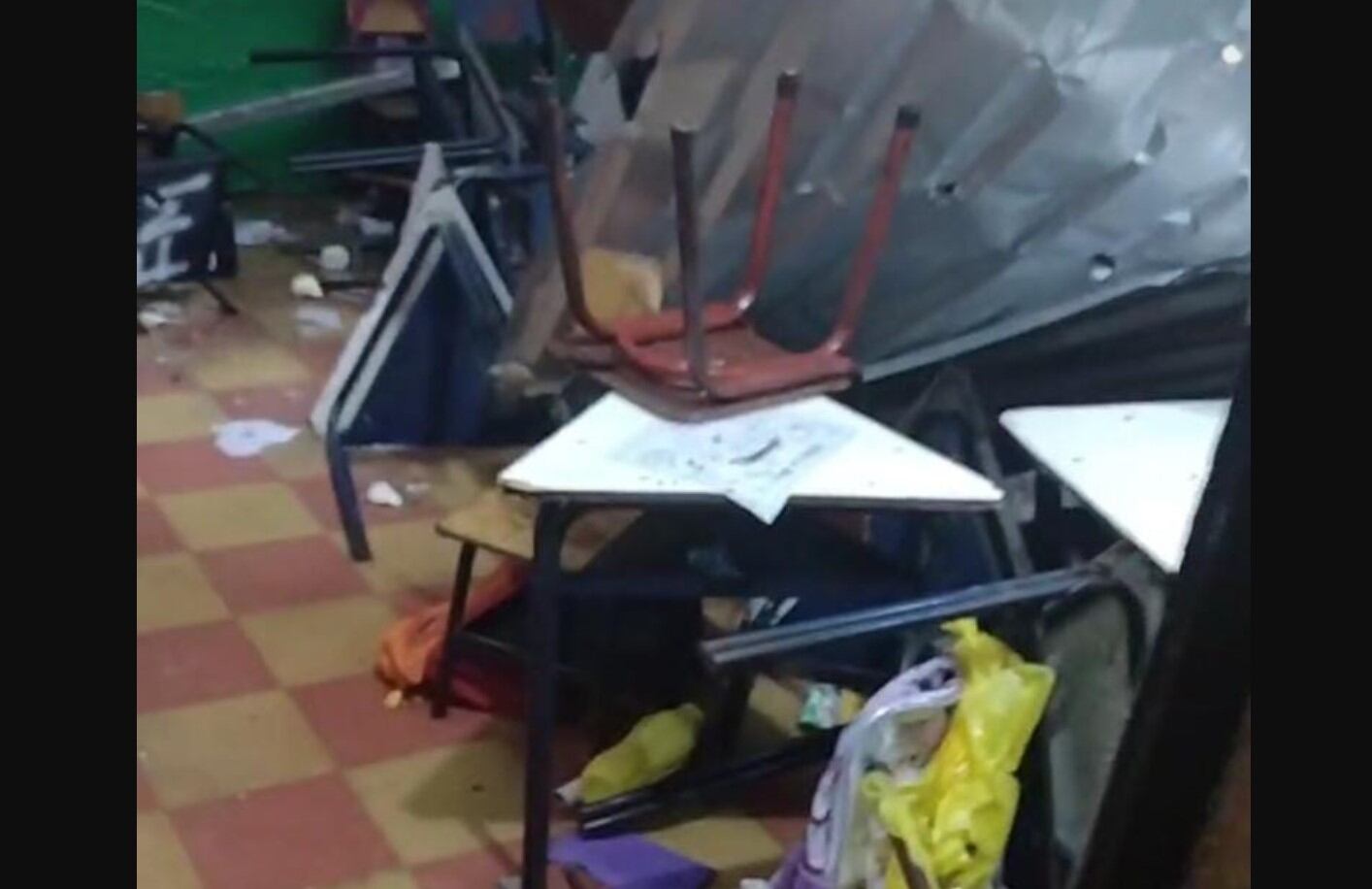 De acuerdo con los docentes, un techo de un inmueble cercano al establecimiento se desprendió y cayó sobre la escuela, provocando que, al no soportar el peso, colapsara y se cayera.
