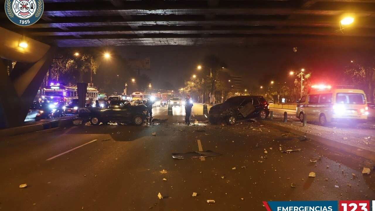 Dos vehículos chocaron de frente en el bulevar Liberación, debajo de los Puentes Gemelos, en zona 11 de la Ciudad Capital. El accidente de tránsito lo cubrieron los Bomberos Municipales.