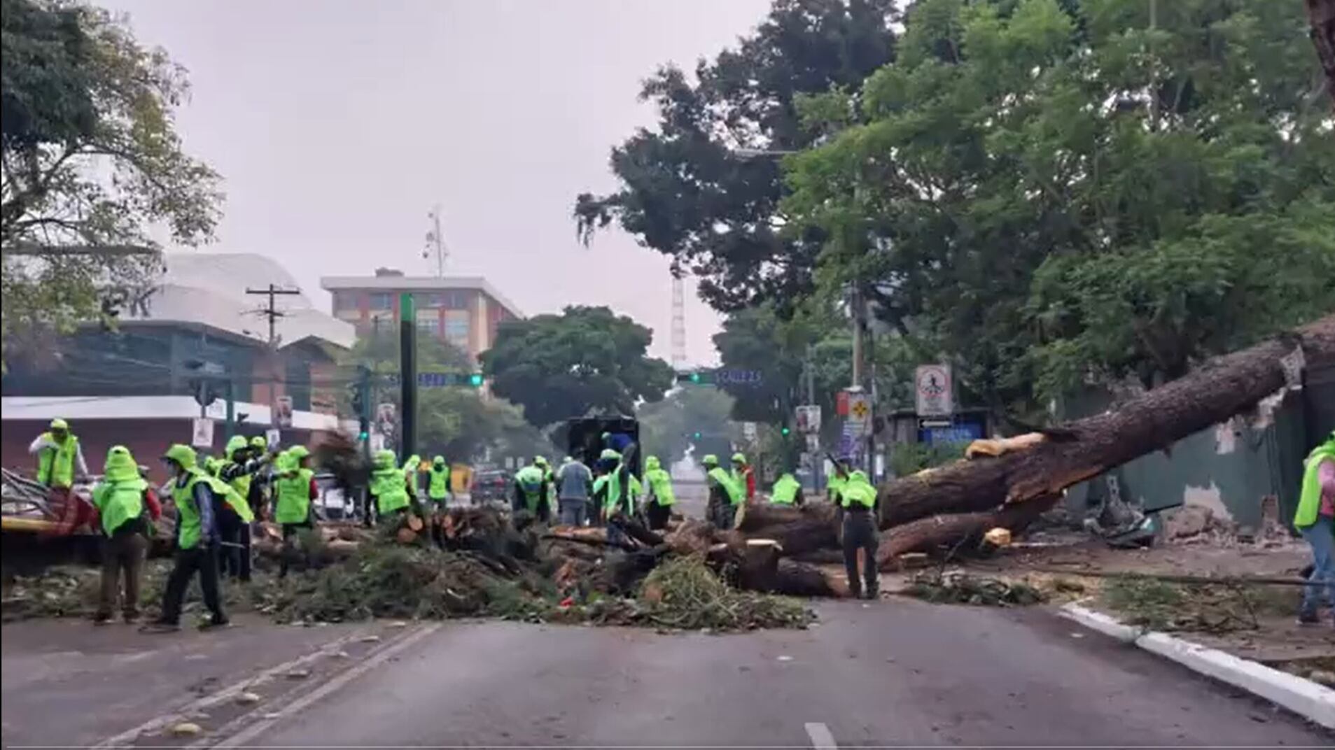 El árbol cayo desde una propiedad privada a la vía pública, lo que provocó daños a paredes, a un parabus del Transmetro, además afectó el cableado del servicio de energía eléctrica y fibra óptica.
