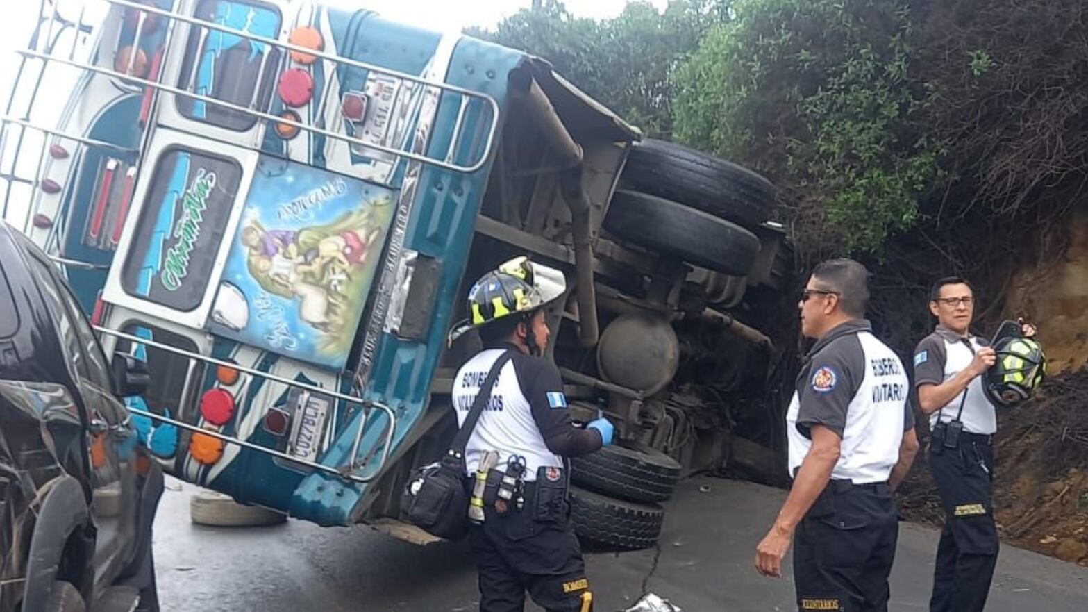 Un bus del transporte extraurbano de los transportes Poaquileña se quedó sin una llanta delantera y volcó en el kilómetro 44 de la Ruta Interamericana, en Sumpango, Sacatepéquez, reportaron los Bomberos Voluntarios, la mañana de este miércoles 31 de mayo.